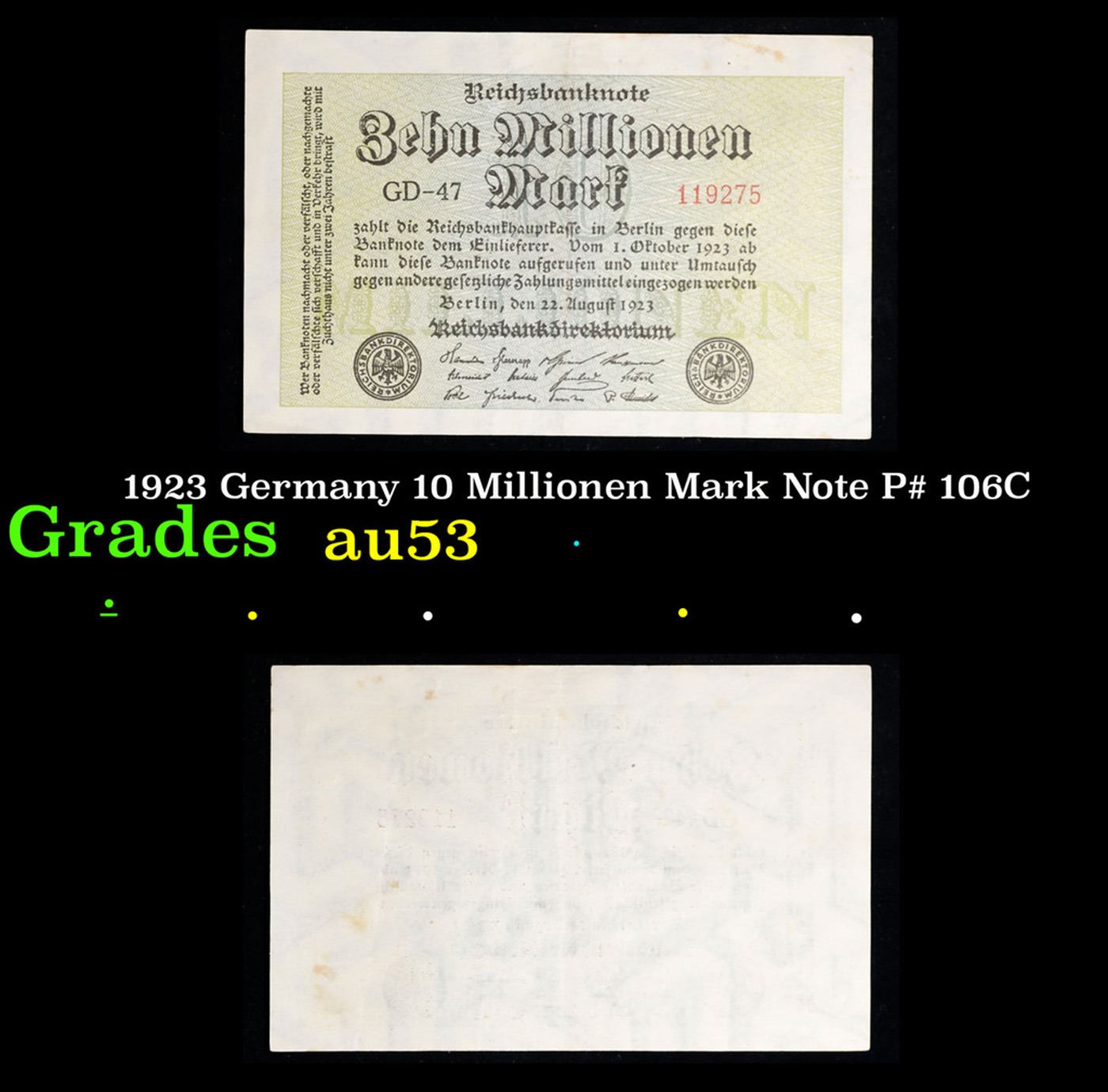 1923 Germany 10 Millionen Mark Note P# 106C Grades Select AU. In the early 1920s, post-WWI Germany saw its economy spiraling out of control. Hyperinflation started directly after the war in 1918, but truly took over the Weimar Republic from 1921 to 1923. The value of the Mark declined incredibly rapidly. 1 USD was equal to 50 German Marks at the beginning of 1920. Toward the end of 1923, 1 USD was equal to over 4,200,000,000,000 German Marks. At times, denominations of the Mark became less valuable than the paper and labor to print it almost immediately after printing. Thus, denominations of the Mark notes became incredibly large, ending up in the tens of trillions.