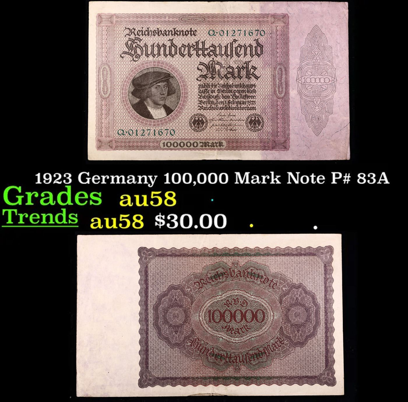 1923 Germany 100,000 Mark Note P# 83A Grades Choice AU/BU Slider. In the early 1920s, post-WWI Germany saw its economy spiraling out of control. Hyperinflation started directly after the war in 1918, but truly took over the Weimar Republic from 1921 to 1923. The value of the Mark declined incredibly rapidly. 1 USD was equal to 50 German Marks at the beginning of 1920. Toward the end of 1923, 1 USD was equal to over 4,200,000,000,000 German Marks. At times, denominations of the Mark became less valuable than the paper and labor to print it almost immediately after printing. Thus, denominations of the Mark notes became incredibly large, ending up in the tens of trillions.