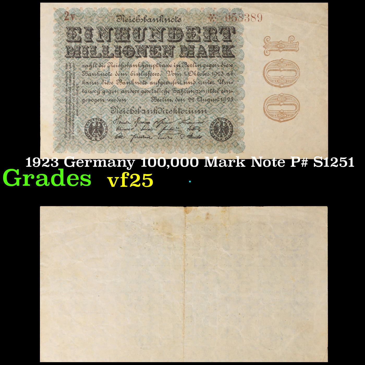 1923 Germany 100,000 Mark Note P# S1251 Grades vf+