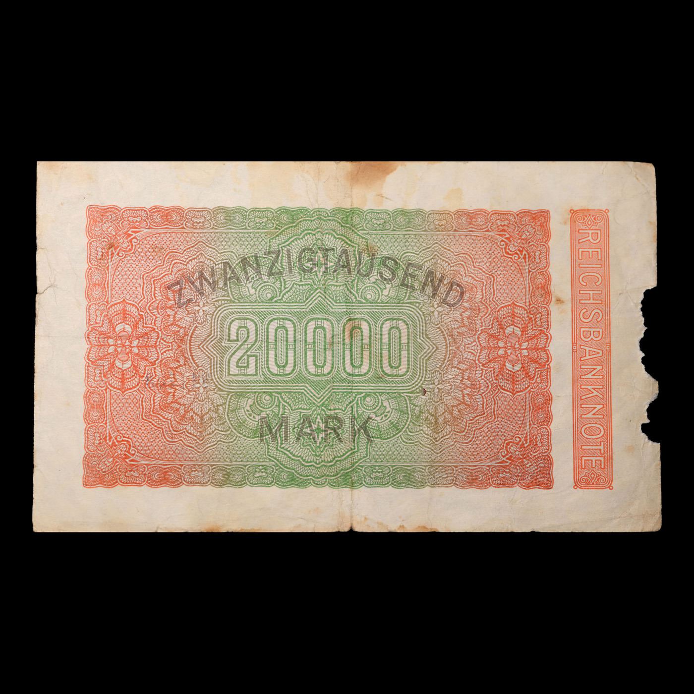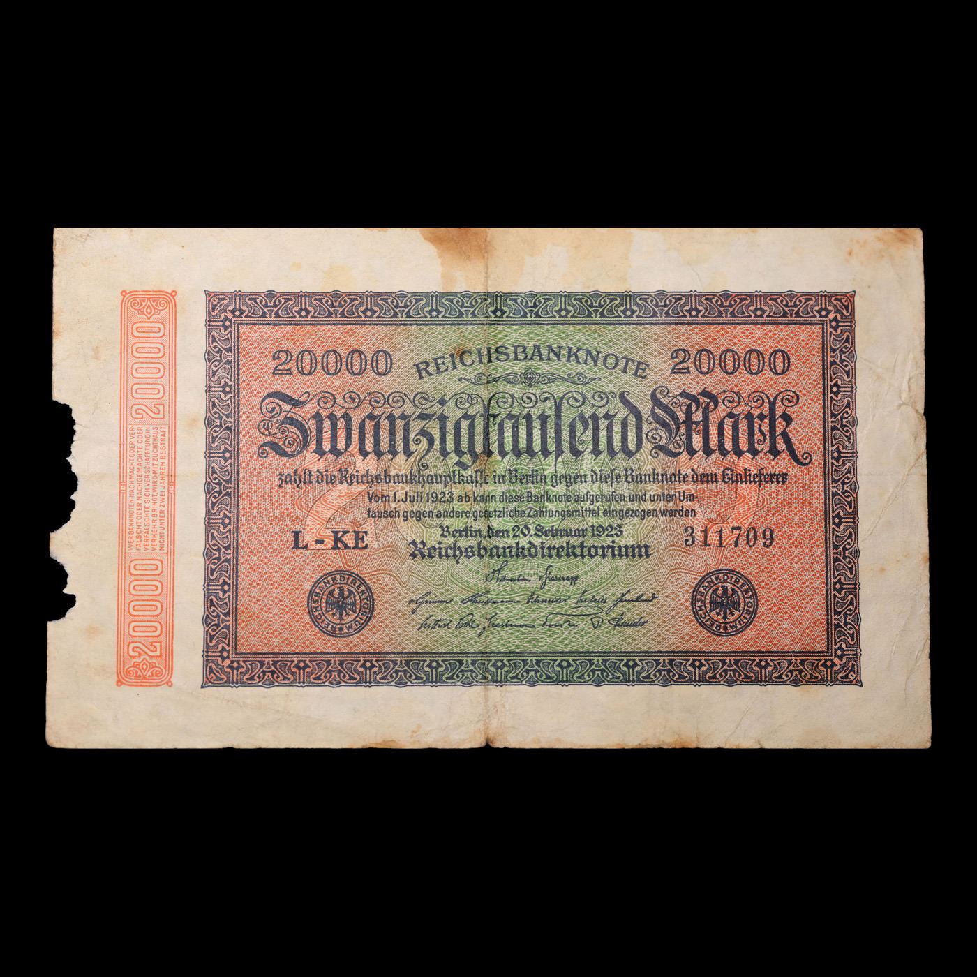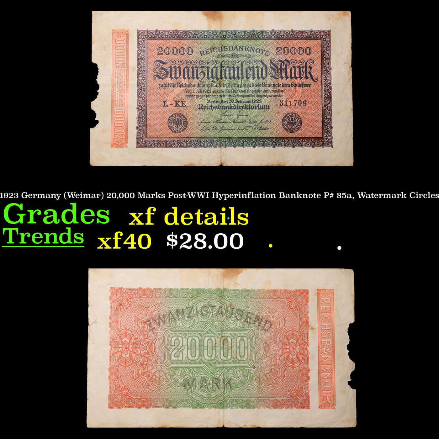 1923 Germany (Weimar) 20,000 Marks Post-WWI Hyperinflation Banknote P# 85a, Watermark Circles Grades xf details. In the early 1920s, post-WWI Germany saw its economy spiraling out of control. Hyperinflation started directly after the war in 1918, but truly took over the Weimar Republic from 1921 to 1923. The value of the Mark declined incredibly rapidly. 1 USD was equal to 50 German Marks at the beginning of 1920. Toward the end of 1923, 1 USD was equal to over 4,200,000,000,000 German Marks. At times, denominations of the Mark became less valuable than the paper and labor to print it almost immediately after printing. Thus, denominations of the Mark notes became incredibly large, ending up in the tens of trillions.