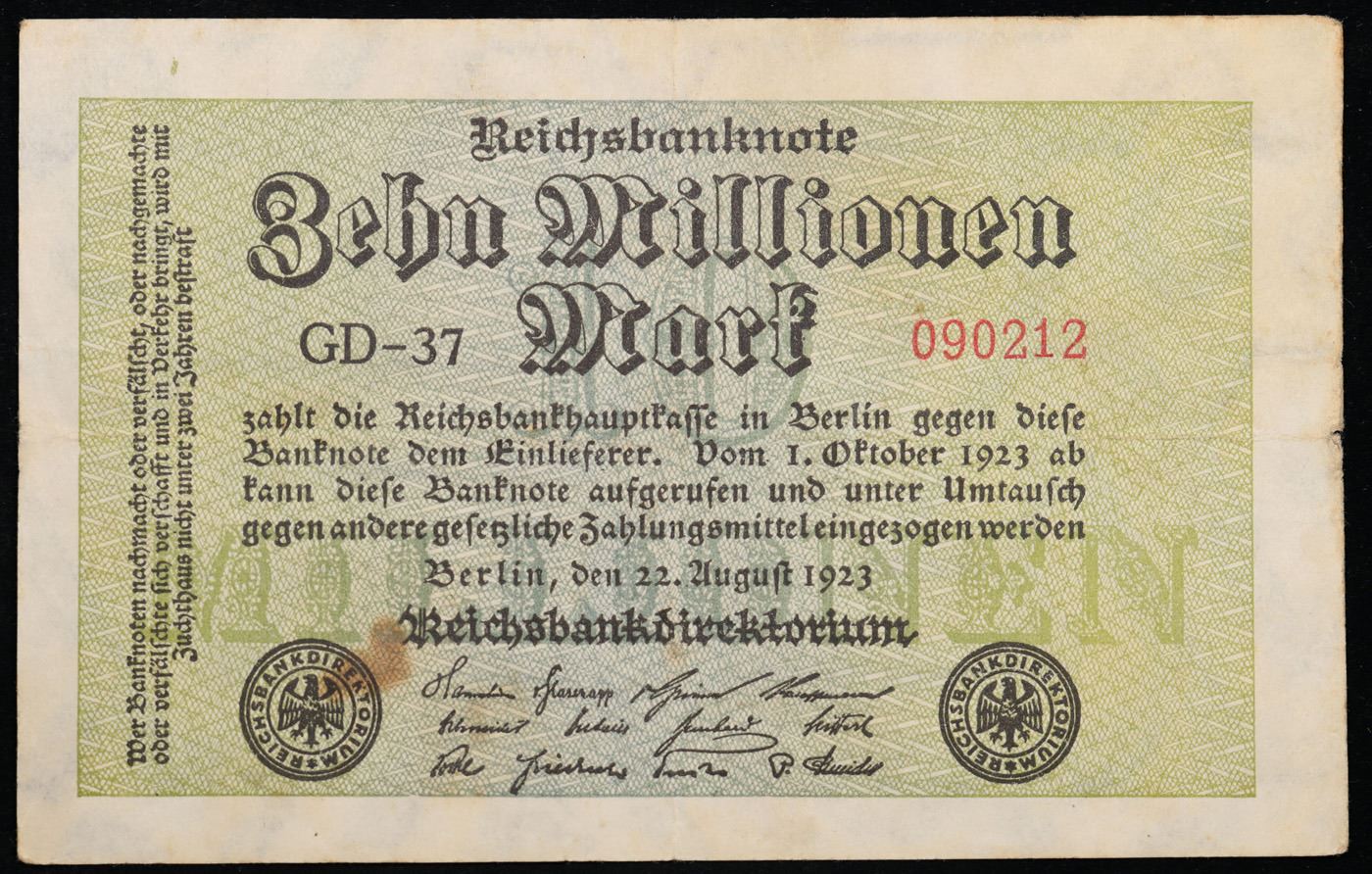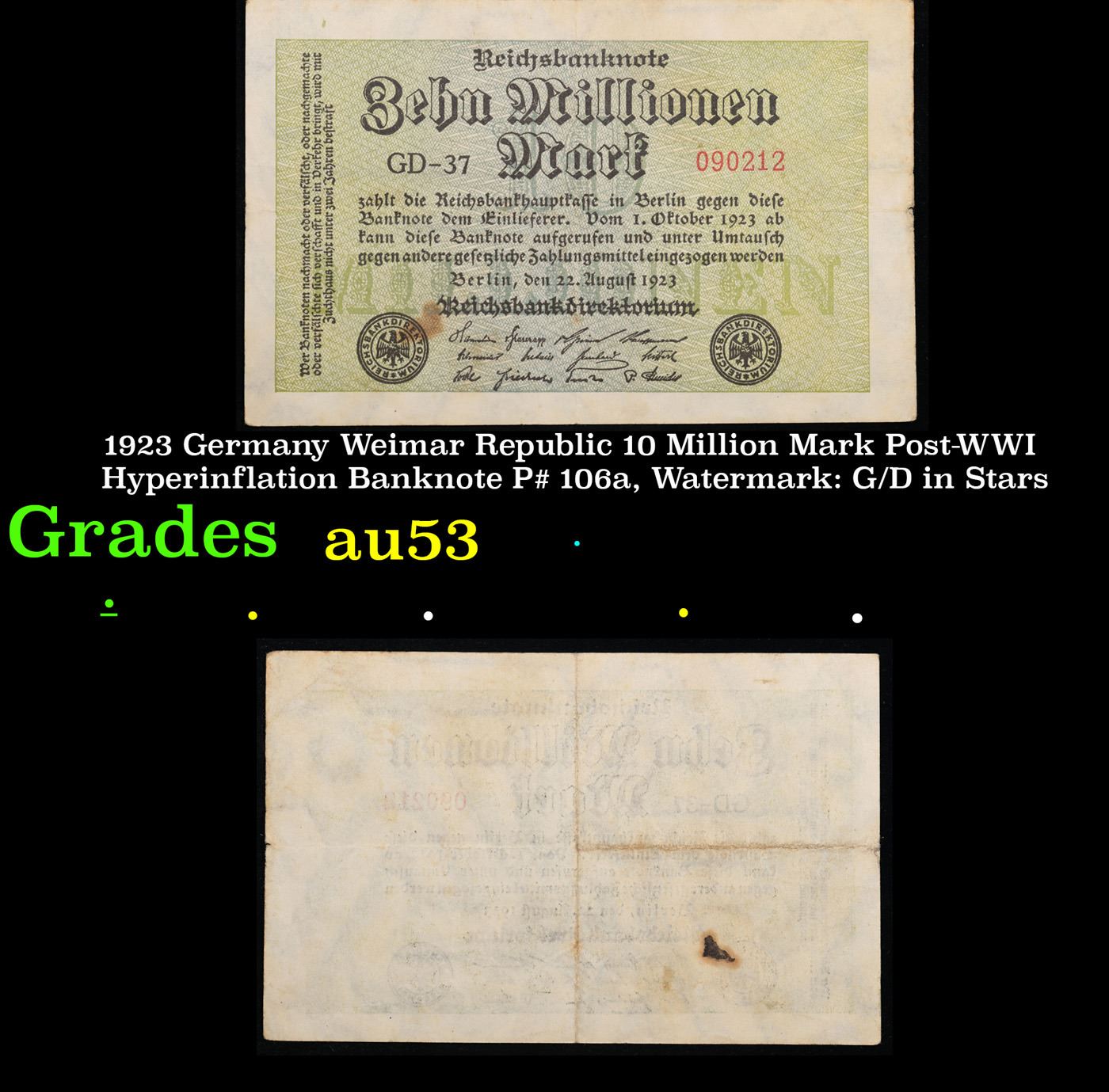 1923 Germany Weimar Republic 10 Million Mark Post-WWI Hyperinflation Banknote P# 106a, Watermark: G/D in Stars Grades Select AU. In the early 1920s, post-WWI Germany saw its economy spiraling out of control. Hyperinflation started directly after the war in 1918, but truly took over the Weimar Republic from 1921 to 1923. The value of the Mark declined incredibly rapidly. 1 USD was equal to 50 German Marks at the beginning of 1920. Toward the end of 1923, 1 USD was equal to over 4,200,000,000,000 German Marks. At times, denominations of the Mark became less valuable than the paper and labor to print it almost immediately after printing. Thus, denominations of the Mark notes became incredibly large, ending up in the tens of trillions.