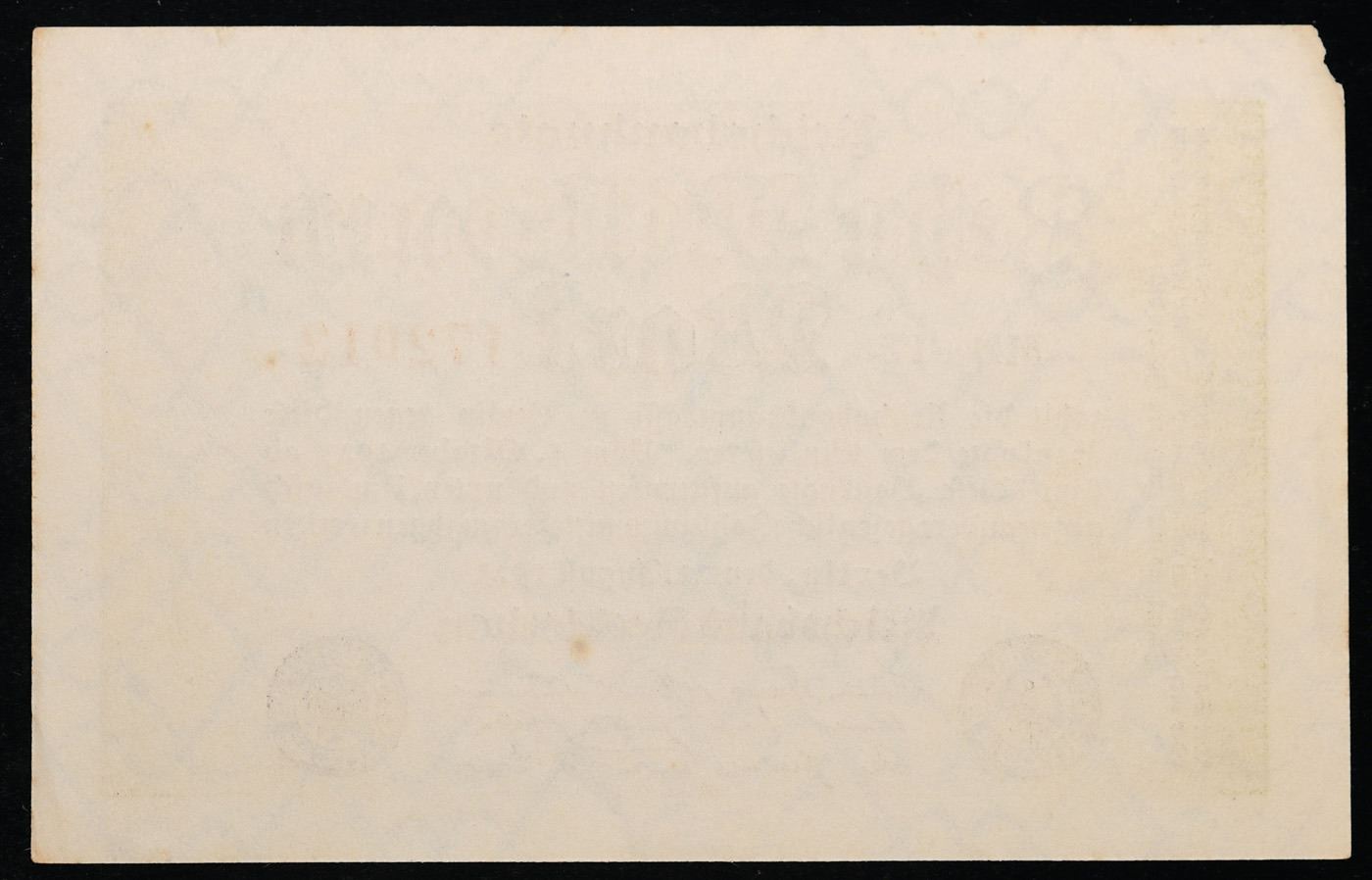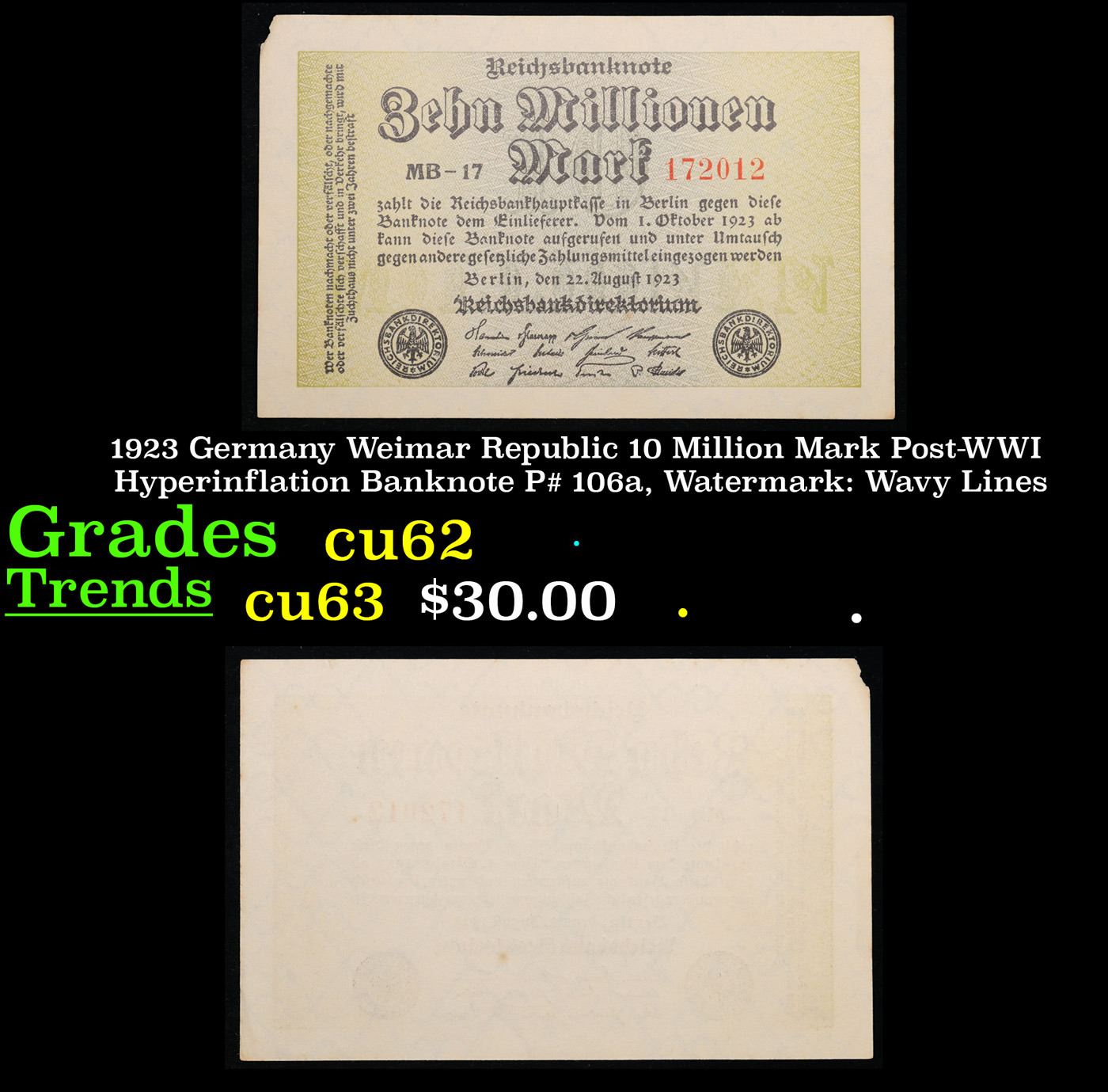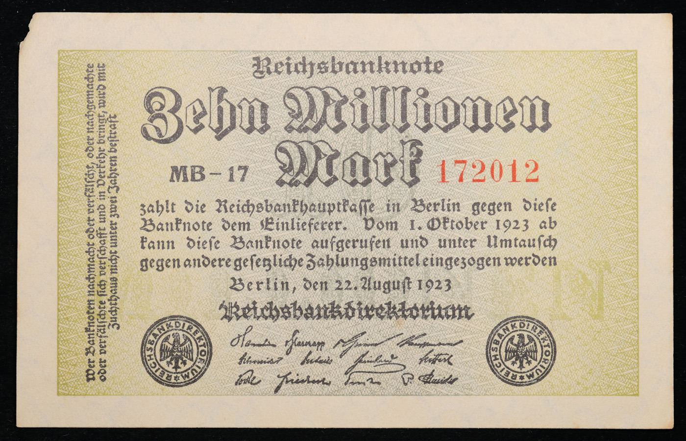 1923 Germany Weimar Republic 10 Million Mark Post-WWI Hyperinflation Banknote P# 106a, Watermark: Wavy Lines Grades select CU. In the early 1920s, post-WWI Germany saw its economy spiraling out of control. Hyperinflation started directly after the war in 1918, but truly took over the Weimar Republic from 1921 to 1923. The value of the Mark declined incredibly rapidly. 1 USD was equal to 50 German Marks at the beginning of 1920. Toward the end of 1923, 1 USD was equal to over 4,200,000,000,000 German Marks. At times, denominations of the Mark became less valuable than the paper and labor to print it almost immediately after printing. Thus, denominations of the Mark notes became incredibly large, ending up in the tens of trillions.
