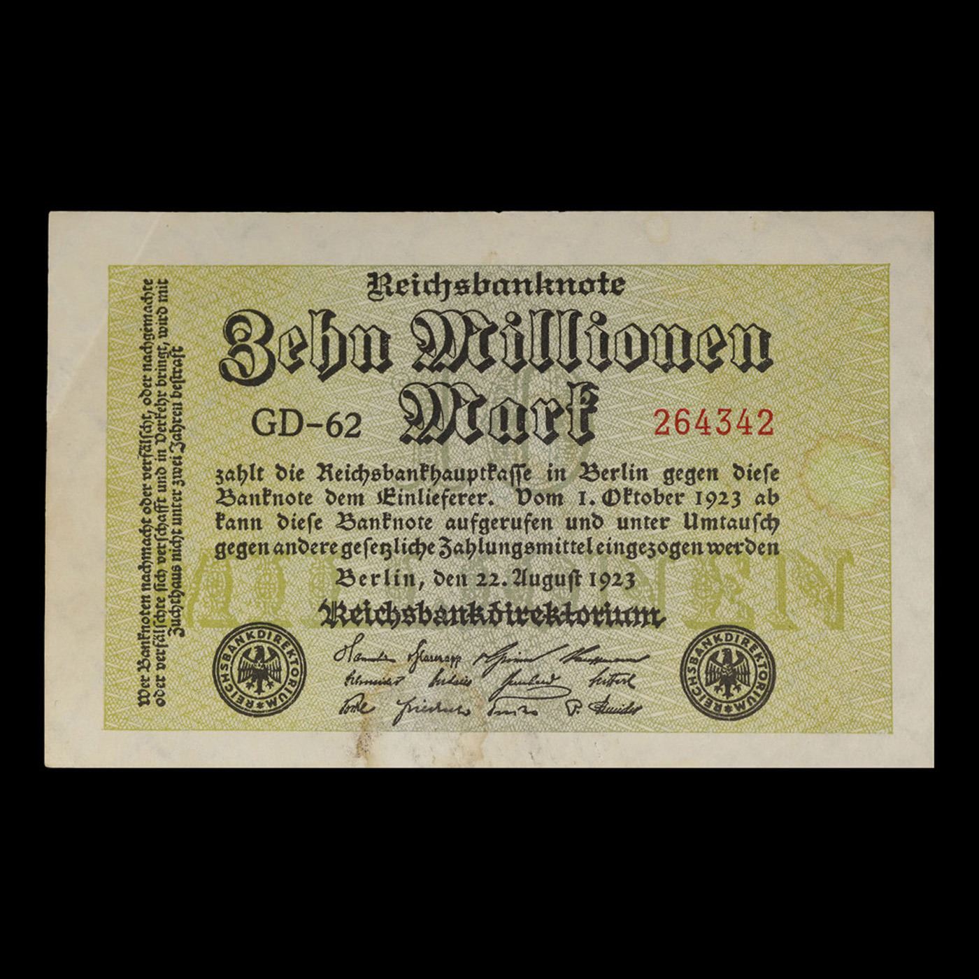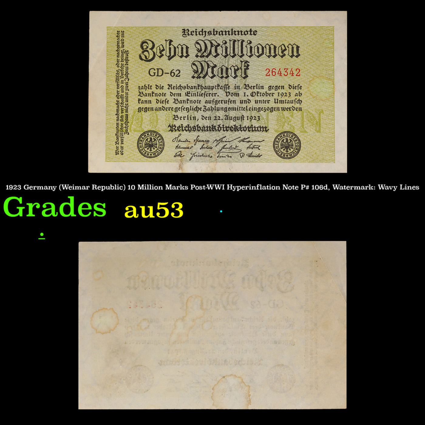 1923 Germany (Weimar Republic) 10 Million Marks Post-WWI Hyperinflation Note P# 106d, Watermark: Wavy Lines Grades Select AU. In the early 1920s, post-WWI Germany saw its economy spiraling out of control. Hyperinflation started directly after the war in 1918, but truly took over the Weimar Republic from 1921 to 1923. The value of the Mark declined incredibly rapidly. 1 USD was equal to 50 German Marks at the beginning of 1920. Toward the end of 1923, 1 USD was equal to over 4,200,000,000,000 German Marks. At times, denominations of the Mark became less valuable than the paper and labor to print it almost immediately after printing. Thus, denominations of the Mark notes became incredibly large, ending up in the tens of trillions.