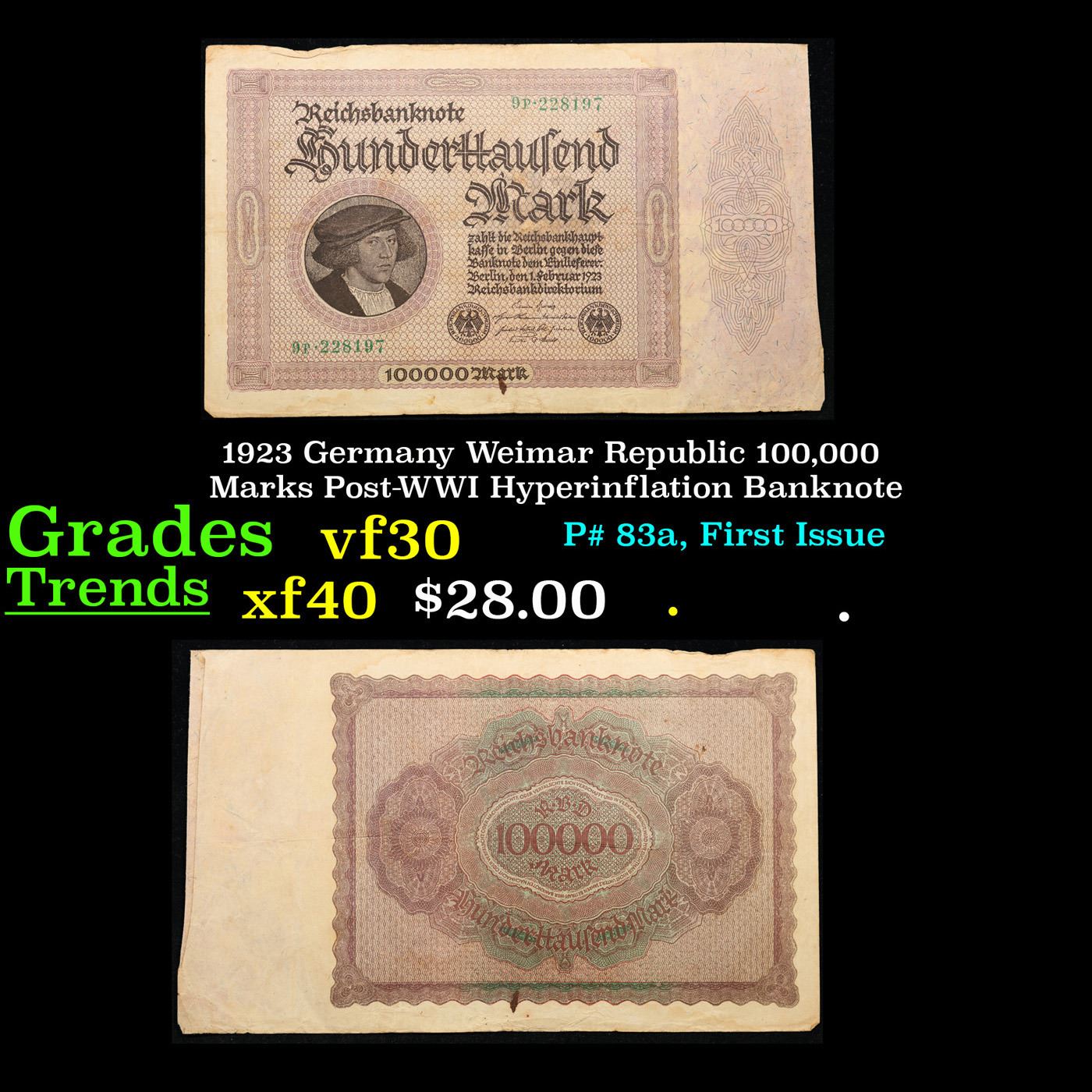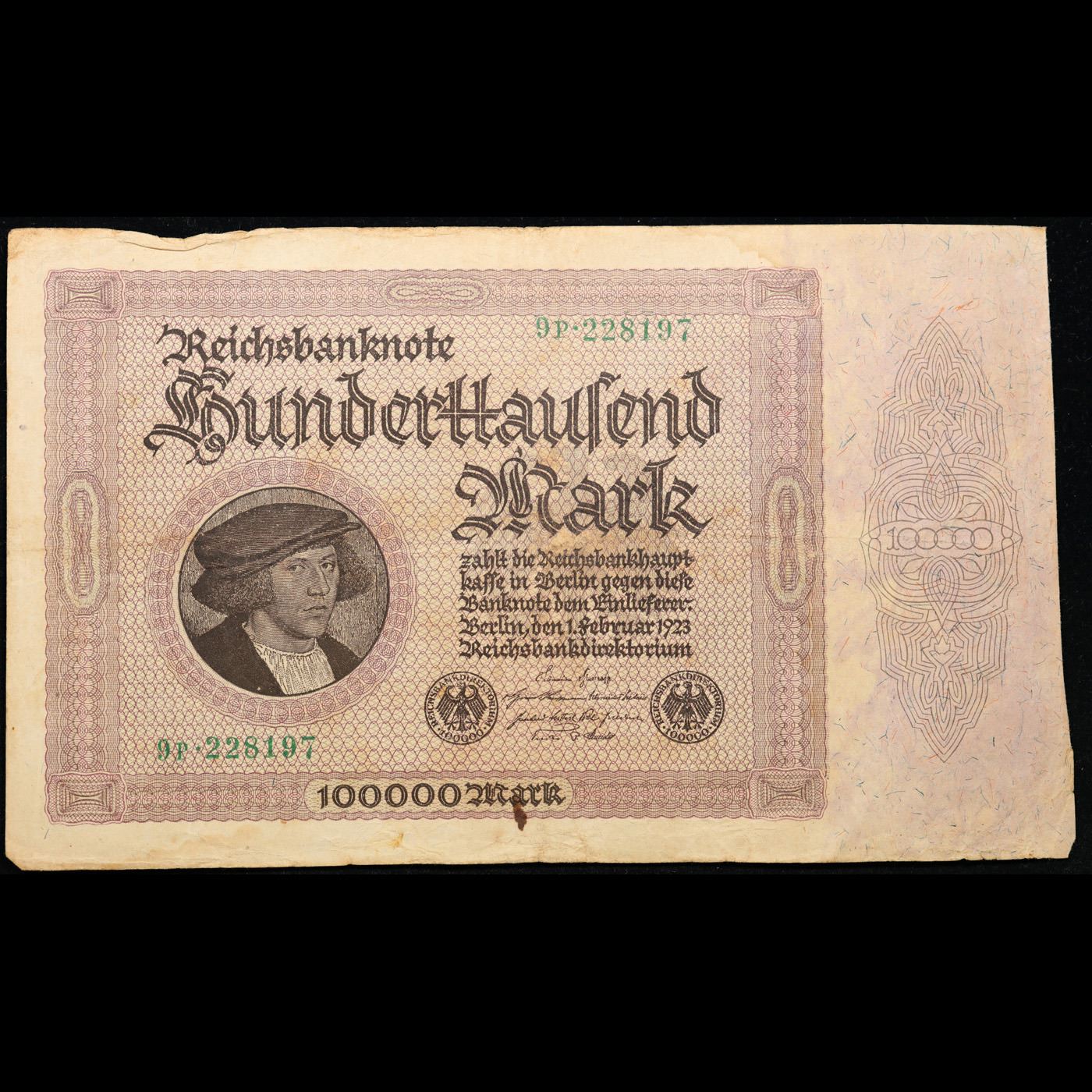 1923 Germany Weimar Republic 100,000 Marks Post-WWI Hyperinflation Banknote Grades vf++. In the early 1920s, post-WWI Germany saw its economy spiraling out of control. Hyperinflation started directly after the war in 1918, but truly took over the Weimar Republic from 1921 to 1923. The value of the Mark declined incredibly rapidly. 1 USD was equal to 50 German Marks at the beginning of 1920. Toward the end of 1923, 1 USD was equal to over 4,200,000,000,000 German Marks. At times, denominations of the Mark became less valuable than the paper and labor to print it almost immediately after printing. Thus, denominations of the Mark notes became incredibly large, ending up in the tens of trillions.