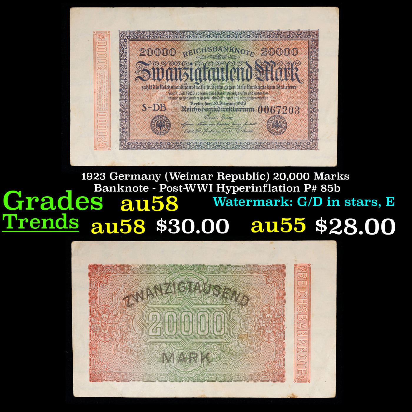 1923 Germany (Weimar Republic) 20,000 Marks Banknote - Post-WWI Hyperinflation P# 85b Grades Choice AU/BU Slider. In the early 1920s, post-WWI Germany saw its economy spiraling out of control. Hyperinflation started directly after the war in 1918, but truly took over the Weimar Republic from 1921 to 1923. The value of the Mark declined incredibly rapidly. 1 USD was equal to 50 German Marks at the beginning of 1920. Toward the end of 1923, 1 USD was equal to over 4,200,000,000,000 German Marks. At times, denominations of the Mark became less valuable than the paper and labor to print it almost immediately after printing. Thus, denominations of the Mark notes became incredibly large, ending up in the tens of trillions.