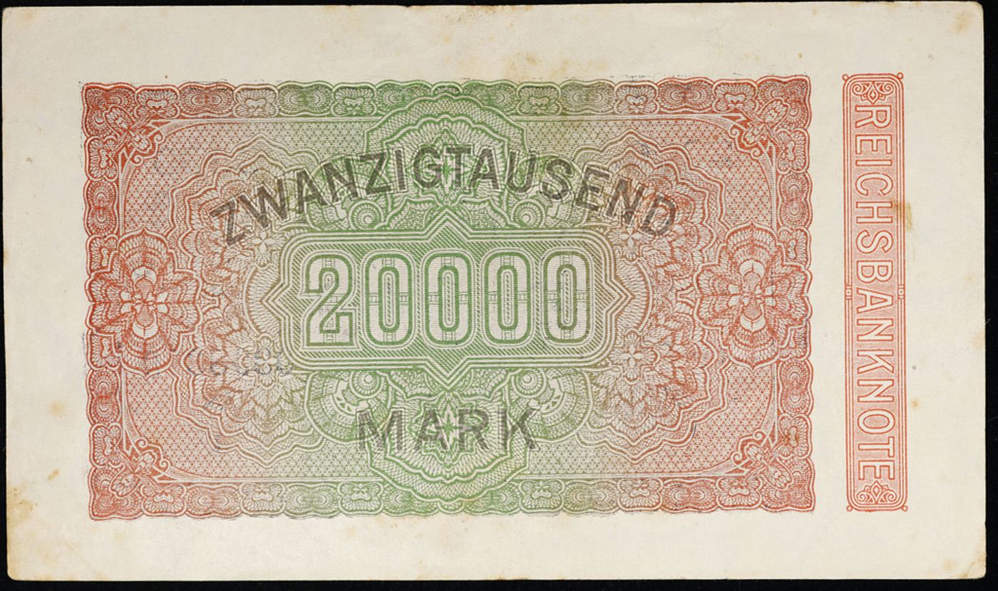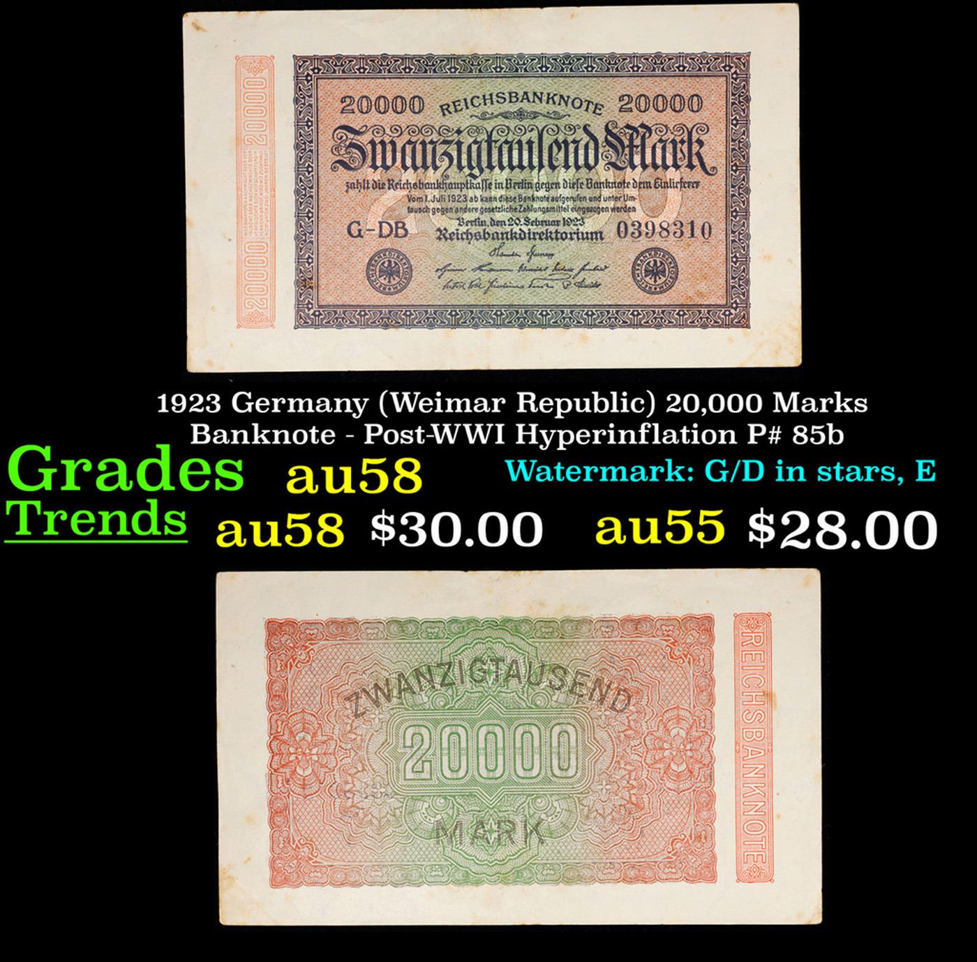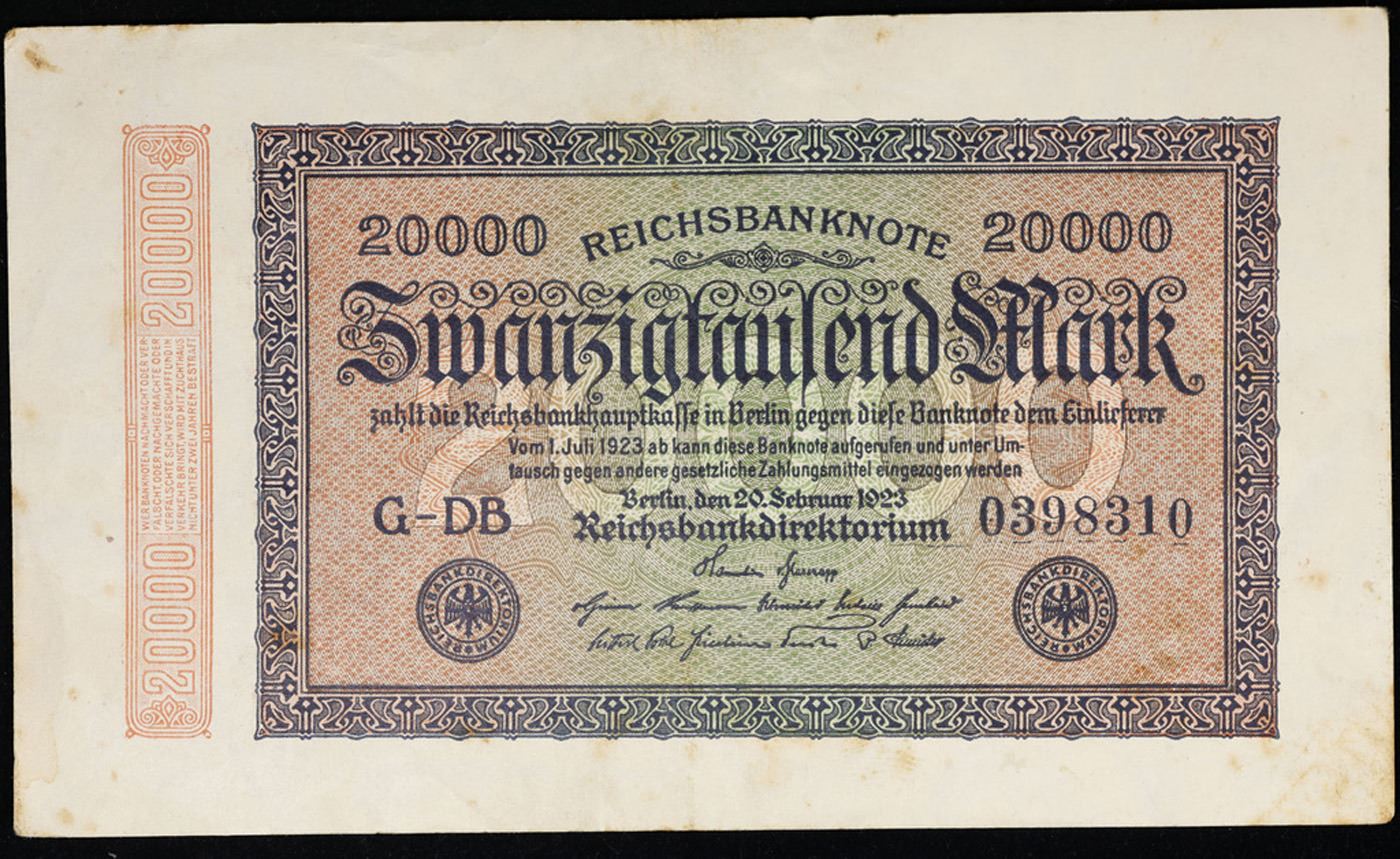 1923 Germany (Weimar Republic) 20,000 Marks Banknote - Post-WWI Hyperinflation P# 85b Grades Choice AU/BU Slider. In the early 1920s, post-WWI Germany saw its economy spiraling out of control. Hyperinflation started directly after the war in 1918, but truly took over the Weimar Republic from 1921 to 1923. The value of the Mark declined incredibly rapidly. 1 USD was equal to 50 German Marks at the beginning of 1920. Toward the end of 1923, 1 USD was equal to over 4,200,000,000,000 German Marks. At times, denominations of the Mark became less valuable than the paper and labor to print it almost immediately after printing. Thus, denominations of the Mark notes became incredibly large, ending up in the tens of trillions.