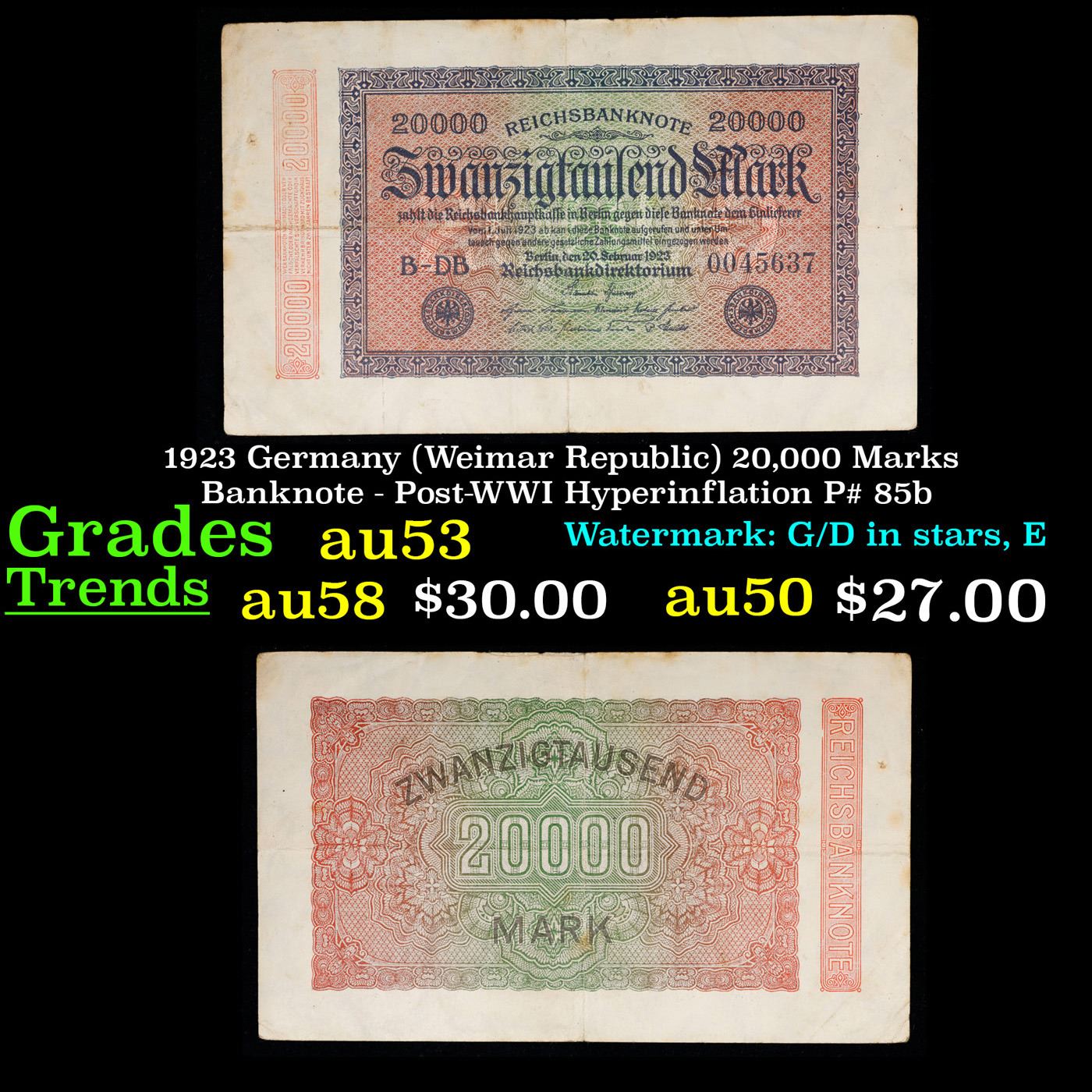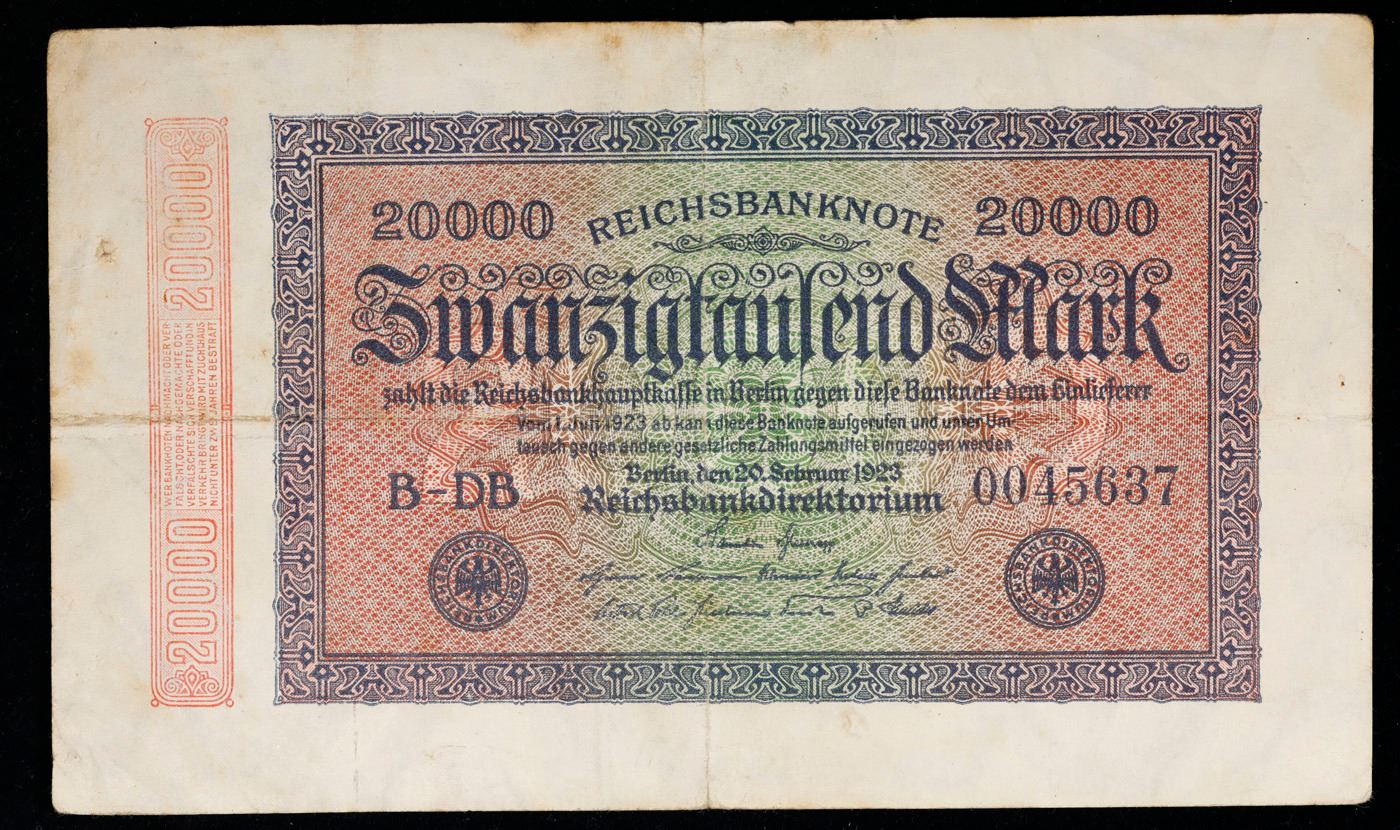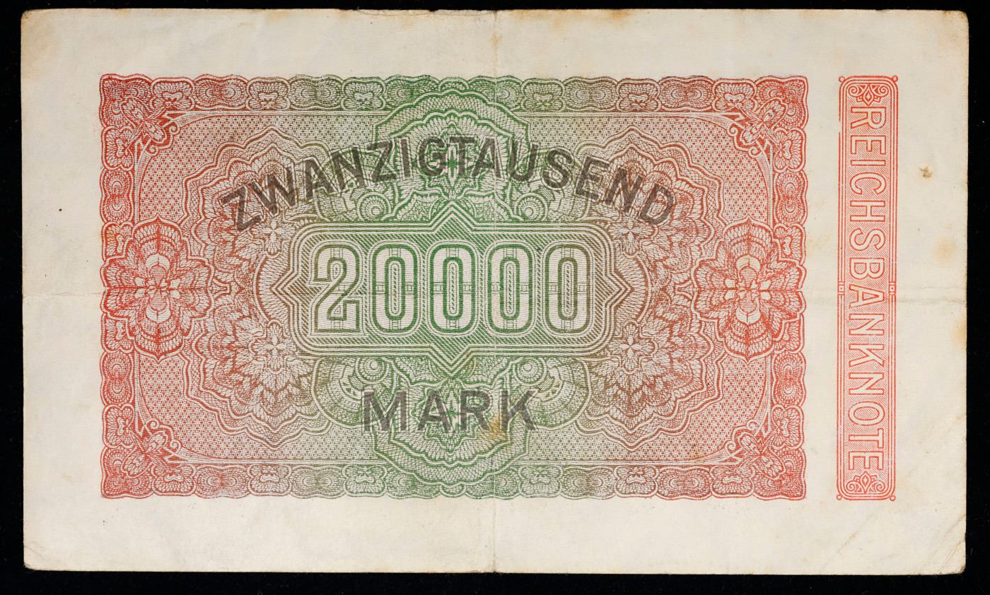 1923 Germany (Weimar Republic) 20,000 Marks Banknote - Post-WWI Hyperinflation P# 85b Grades Select AU. In the early 1920s, post-WWI Germany saw its economy spiraling out of control. Hyperinflation started directly after the war in 1918, but truly took over the Weimar Republic from 1921 to 1923. The value of the Mark declined incredibly rapidly. 1 USD was equal to 50 German Marks at the beginning of 1920. Toward the end of 1923, 1 USD was equal to over 4,200,000,000,000 German Marks. At times, denominations of the Mark became less valuable than the paper and labor to print it almost immediately after printing. Thus, denominations of the Mark notes became incredibly large, ending up in the tens of trillions.