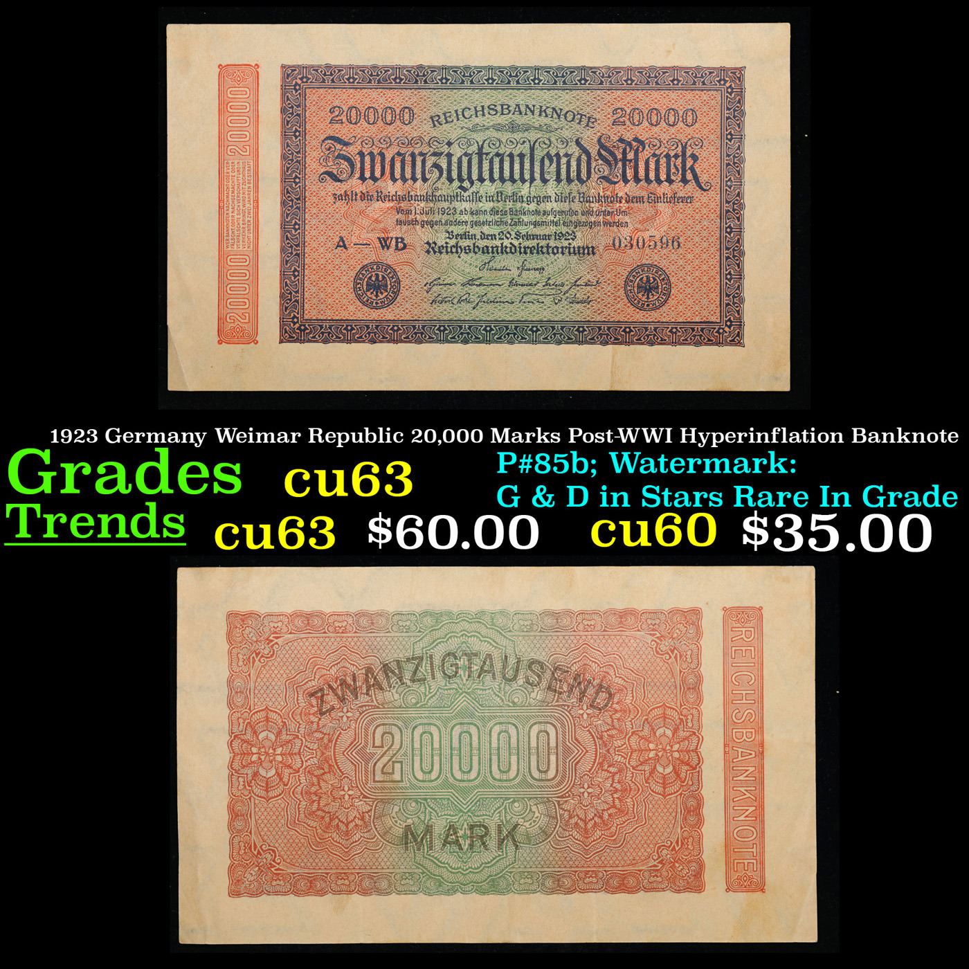 1923 Germany Weimar Republic 20,000 Marks Post-WWI Hyperinflation Banknote Grades Select CU