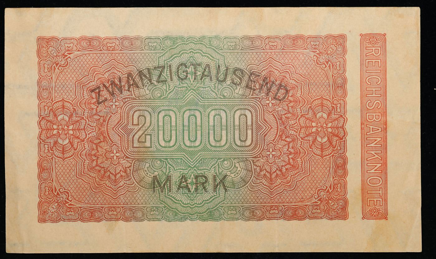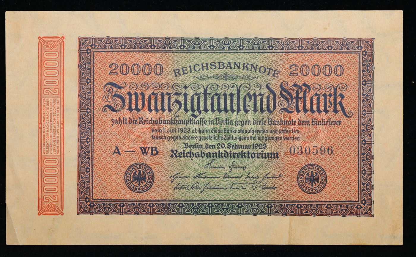 1923 Germany Weimar Republic 20,000 Marks Post-WWI Hyperinflation Banknote Grades Select CU. In the early 1920s, post-WWI Germany saw its economy spiraling out of control. Hyperinflation started directly after the war in 1918, but truly took over the Weimar Republic from 1921 to 1923. The value of the Mark declined incredibly rapidly. 1 USD was equal to 50 German Marks at the beginning of 1920. Toward the end of 1923, 1 USD was equal to over 4,200,000,000,000 German Marks. At times, denominations of the Mark became less valuable than the paper and labor to print it almost immediately after printing. Thus, denominations of the Mark notes became incredibly large, ending up in the tens of trillions.