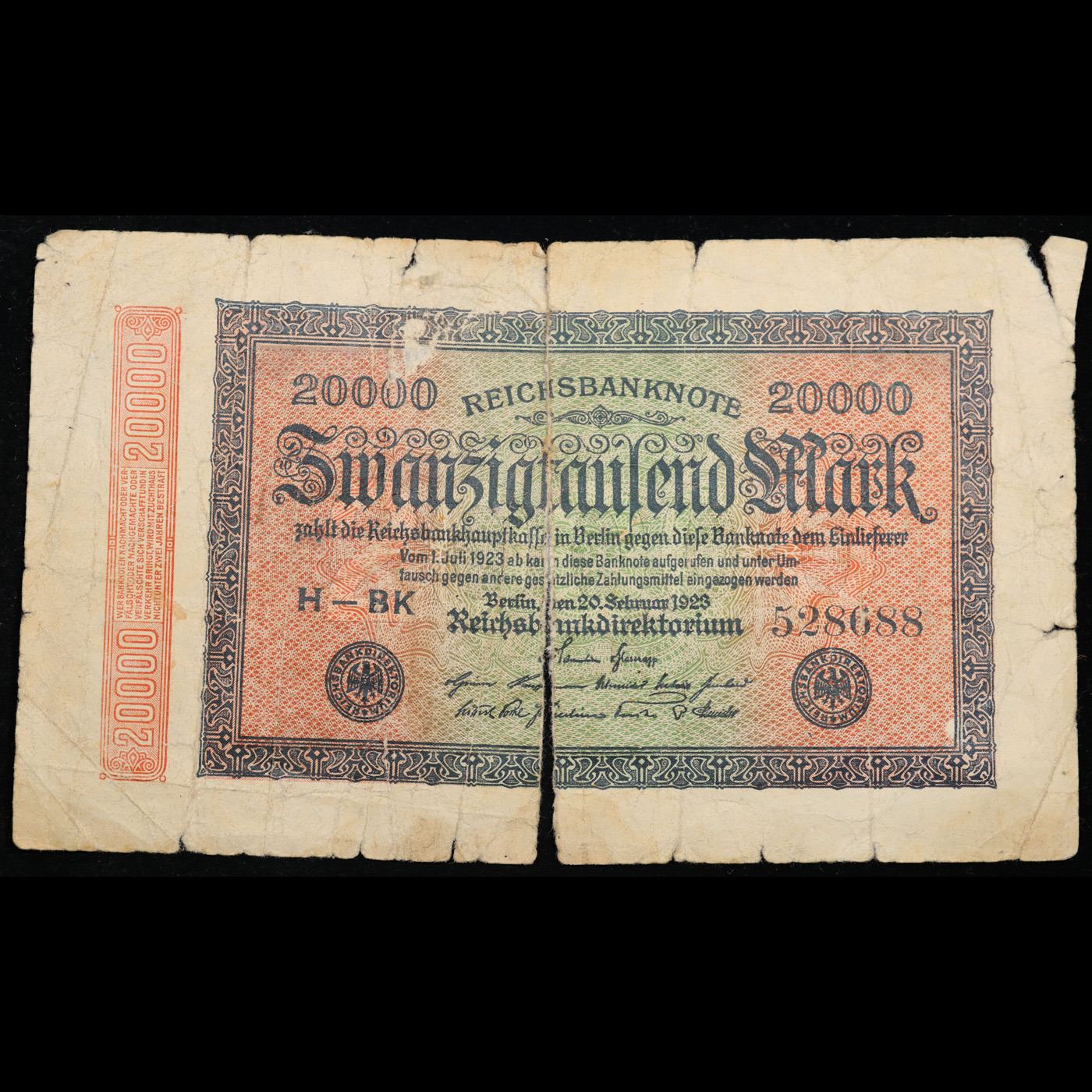1923 Germany Weimar Republic 20,000 Marks Post-WWI Hyperinflation Banknote P#85a; Watermark: Small circles Grades f+.