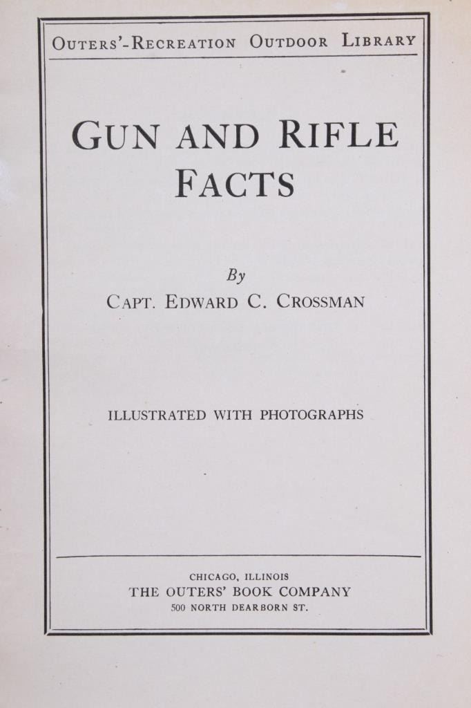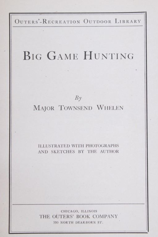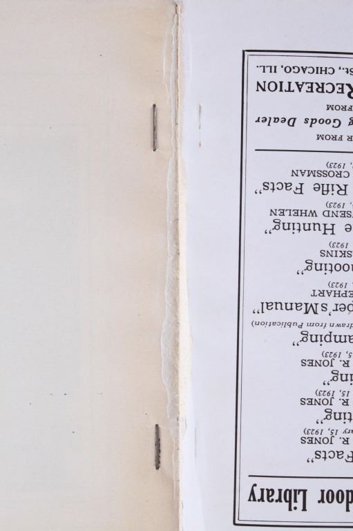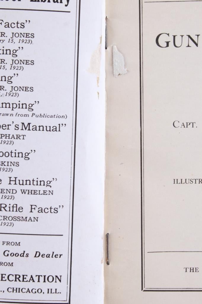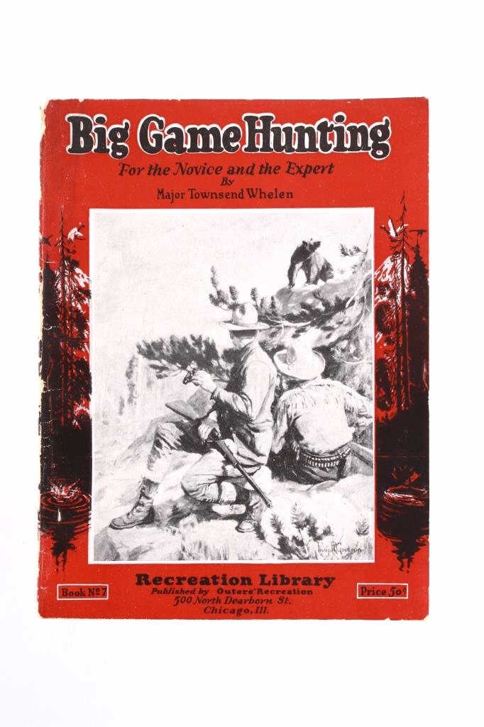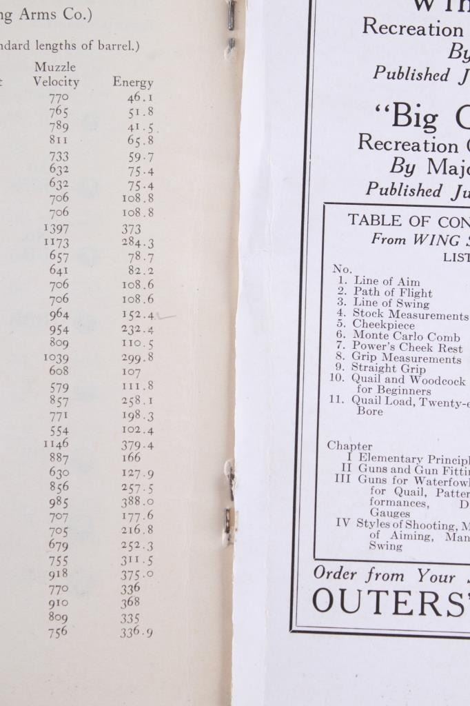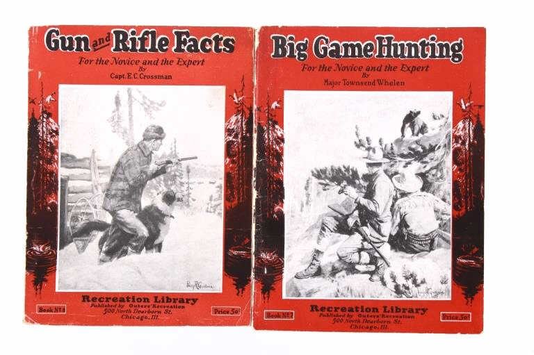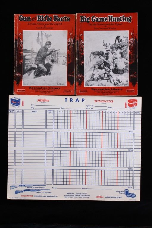 This lot contains two hunting booklets, “Big Game Hunting” by Major Townsend Whelen and “Gun & Rifle Facts” by Capt. E.C. Crossman, published by Outers' Recreation in 1923. Both are part of the Recreation Library. The covers display normal wear, and the pages are in good condition. Also included is a competition trap score sheets pad labeled “Winchester and Western” with natural page discoloration and in good condition. The booklets measure 6.75" H x 5" W each; the sheet pad measures 11" H x 8.75" W approximately.