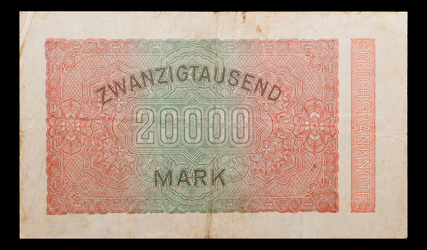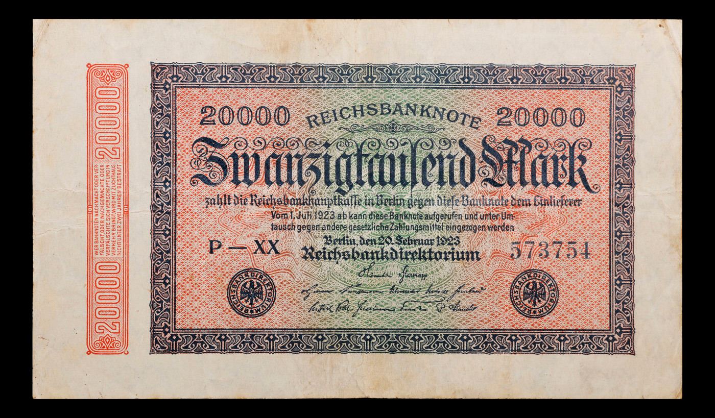 1923 Imperial Germany 20,000 Mark Note P# 85C Grades vf++. In the early 1920s, post-WWI Germany saw its economy spiraling out of control. Hyperinflation started directly after the war in 1918, but truly took over the Weimar Republic from 1921 to 1923. The value of the Mark declined incredibly rapidly. 1 USD was equal to 50 German Marks at the beginning of 1920. Toward the end of 1923, 1 USD was equal to over 4,200,000,000,000 German Marks. At times, denominations of the Mark became less valuable than the paper and labor to print it almost immediately after printing. Thus, denominations of the Mark notes became incredibly large, ending up in the tens of trillions.