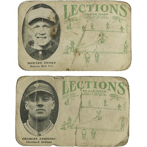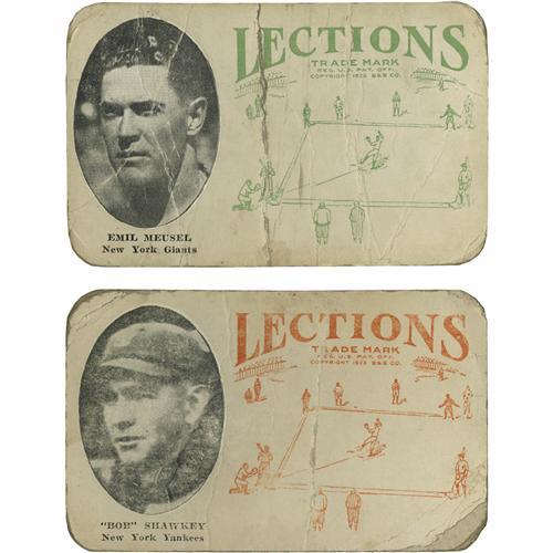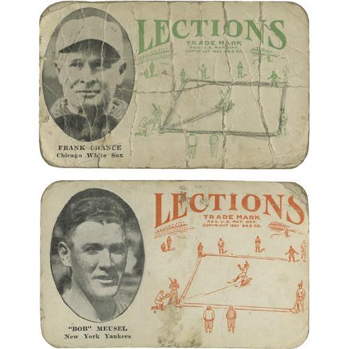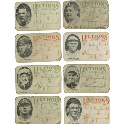 <B>1923 Lections Near Set (8/10) with Ruth, Hornsby.</B></I> Like Bigfoot and the Loch Ness Monster, the supremely scarce cards of the Lections set are almost never seen and shrouded in mystery. Before twenty-eight surfaced in Albany, New York in 1997, collectors were not even aware that the set existed, and it's still unclear exactly what product they initially accompanied. The general consensus is that they are candy cards, but we may never know for certain. Presented here are eight cards from the set of ten, representing an offering that doubles the entire population of PSA-graded examples. Present are "Babe" Ruth, Roger (sic) Hornsby, Frank Chance, "Bob" Meusel, Emil Meusel, "Bob" Shawkey, Howard Ehmke and Charles Jamieson. Condition is admittedly rough, with all displaying some degree of heavy creasing and wear, and Ruth and Chance showing pencil writing as well. Given the microscopic population of such cards available in the hobby, however, such concerns must be taken in context. High-grade examples have never surfaced, and likely never will. For the card collector seeking a true challenge, we lead you four-fifths of the way to the top of the mountain. The rest of the climb is yours alone. <BR><BR><B>Important notice:</B> Heritage usually auctions material at the rate of 200-250 lots per hour. On some occasions eBay Live bid software or the Internet may not be able to keep up with the pace of the auction. We recommend placing a realistic absentee bid now as insurance to avoid disappointment. Occasionally the auctioneer may eliminate or reject an eBay Live bid, and the auctioneer may also reopen a lot after the close of the eBay live bidding (usually because we missed an audience bid), and may reject your bid even if it shows you as the winning bidder. By bidding via eBay Live, you agree that Heritage may award the lot to another bidder at its sole discretion under the circumstances described above or any other reasonable circumstances. Since eBay bids are not shown to us until we open the lot on the floor, we treat those bids just like floor bids. In most cases the floor responds before the eBay bid is presented to us, due to Internet lag time, so for consistency we have made it a policy that floor bids are always considered first over tie eBay live bids. Also please note that all Heritage lots purchased through eBay Live carry a 22.5% Buyer's Premium. Please make sure you read the Terms and Conditions before you bid. This lot is being auctioned in conjunction with a live floor auction by Heritage Galleries & Auctioneers. All final auction and invoice information will be supplied by Heritage Galleries & Auctioneers, and all other information should be considered preliminary. Lot:19546 <BR><BR><B>Winning Notification and Billing:</B> After the FINAL session in this auction is complete, Heritage will send e-mail and snail mail invoices. This process normally takes several days. All final auction and invoice information will be supplied by Heritage Galleries & Auctioneers, and all other information should be considered preliminary. <BR><BR>This auction will be conducted on a live auction floor and over the Internet through eBay Live. If you choose to place an absentee bid, please take a moment to <font color='#0000ff'><u><a href='http://pages.ebay.com/liveauctions/help/before/laabsentee.html'>learn how eBay Live absentee bidding works</a></u></font><font color='#000000'>