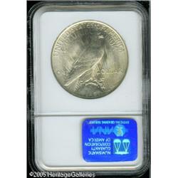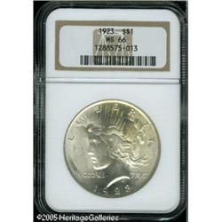 <B>1923<img border='0' src='http://www.heritagecoins.com/images/star.gif' width=10 height=10>$1 MS66 NGC.</B></I> Satiny surfaces lack any grade-prohibiting marks and show some patches of faint gold toning over rich luster. A perfect selection for type purposes. Lot:10695
