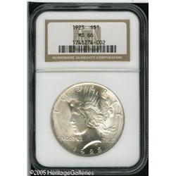 <B>1923<img border='0' src='http://www.heritagecoins.com/images/star.gif' width=10 height=10>$1 MS66 NGC.</B></I> Snow-white and exceptionally lustrous with definition in Liberty's hair that typically go unnoticed due to the striking difficulty that is associated with the issue. A fabulous dollar that is sure to please its next owner.<BR><I>From The Banks Collection.</B></I> Lot:10694