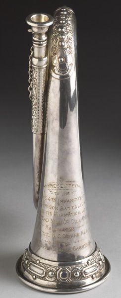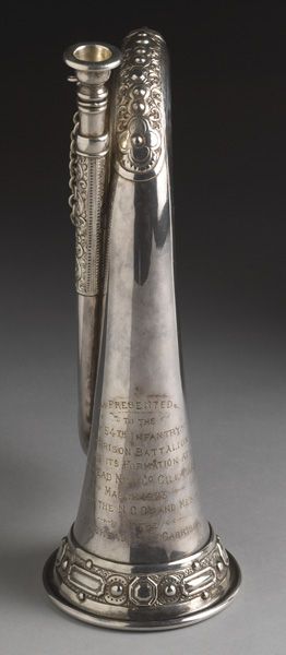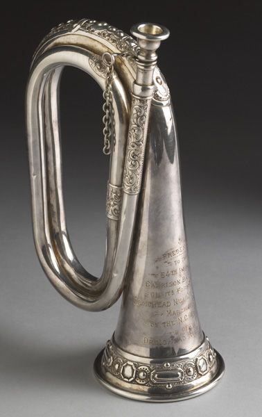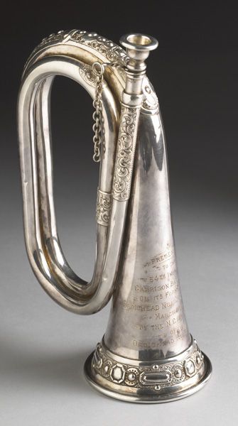 An extremely fine silver plated decorative presentation bugle by Potter of Aldershot. With original inscription "Presented to the 54th Infantry Garrison Battalion on its formation at Droichead Nua, Co. Cill Dara March 1923 by the NCO's and men of the Droichead Nua Garrison" Contained in its original fitted wooden case. A unique and desirable item