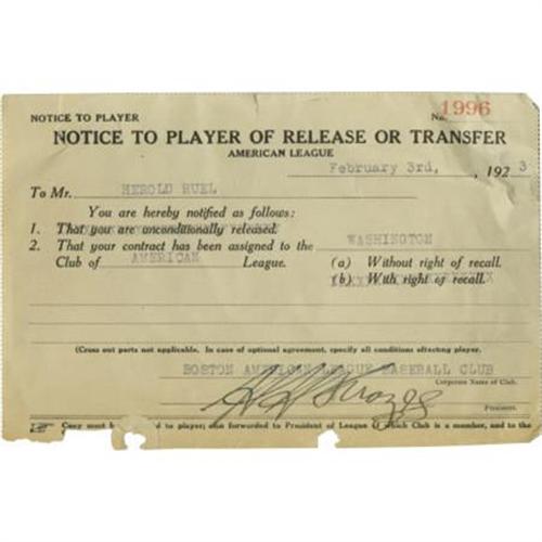 <B>1923 Muddy Ruel Transfer to Senators Card Signed By Harry Frazee.</B></I> Notice that was given to Muddy Ruel in 1923 informing him that he would no longer play for the Boston Red Sox, but would be a Washington Senator instead. Ruel would go on to drive in the 1924 World Series-winning hit in the 12th inning of Game 7. Signed by then-president of the Red Sox, Harry Frazee, who was no stranger to filling out such transfer cards -- it was Frazee who infamously sold Babe Ruth to the New York Yankees just a few years before. Consigned by the son of Muddy Ruel. <I>LOA from PSA/DNA.</B></I><BR><BR><b>Shipping:</b> Requires 3rd Party Shipping (<a target="_blank" href="http://www.heritageauctions.com/common/shipping.php">view shipping information</a>)