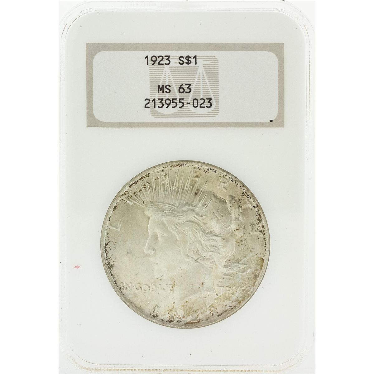 One 1923 NGC MS63 Peace Silver Dollar Coin.