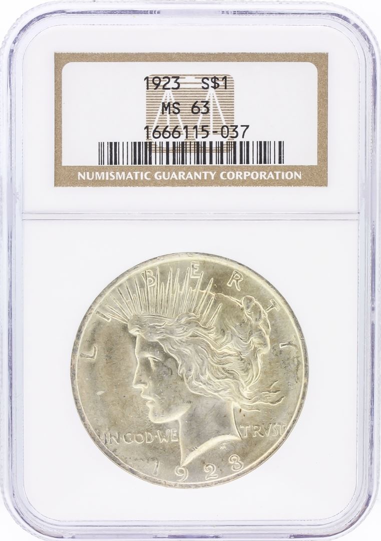 One 1923 NGC MS63 Peace Silver Dollar. NGC Certified.