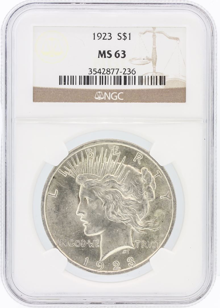 One 1923 NGC MS63 Peace Silver Dollar. NGC Certified.