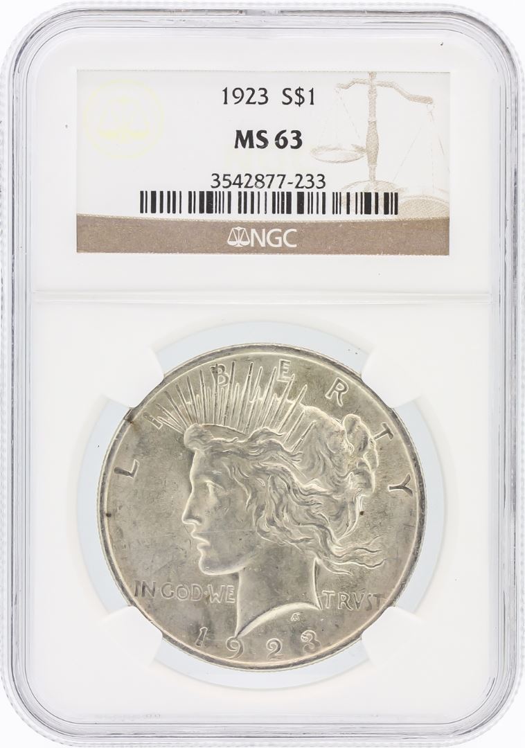 One 1923 NGC MS63 Peace Silver Dollar. NGC Certified.