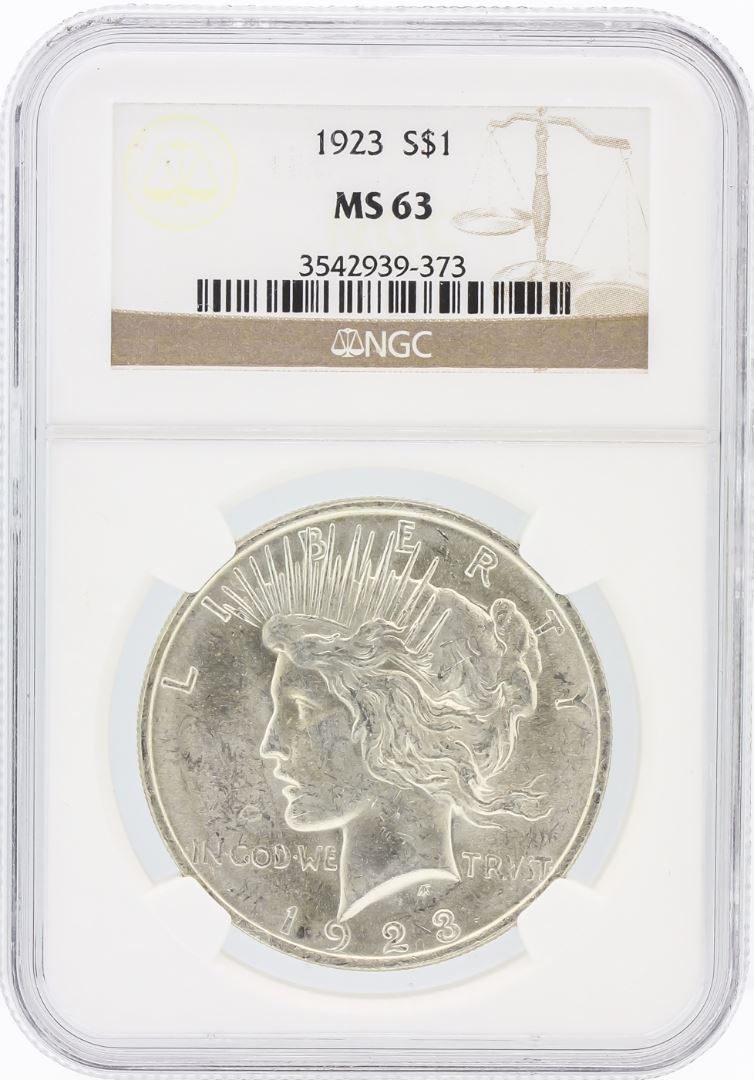 One 1923 NGC MS63 Peace Silver Dollar. NGC Certified.
