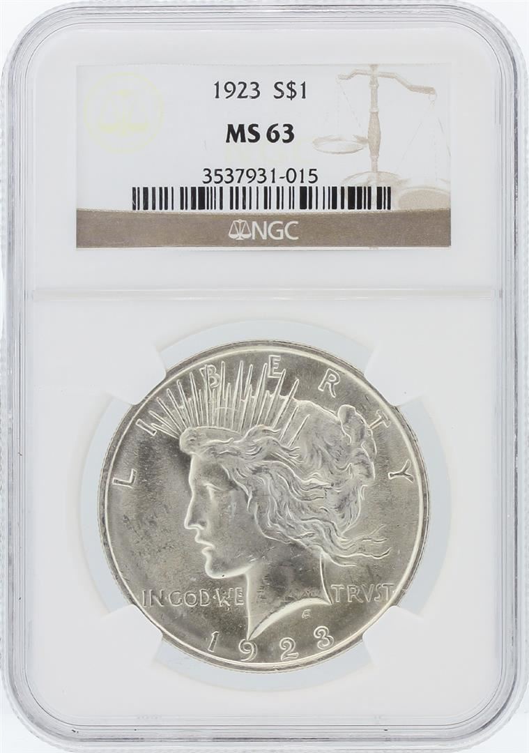 One 1923 NGC MS63 Peace Silver Dollar. NGC Certified.