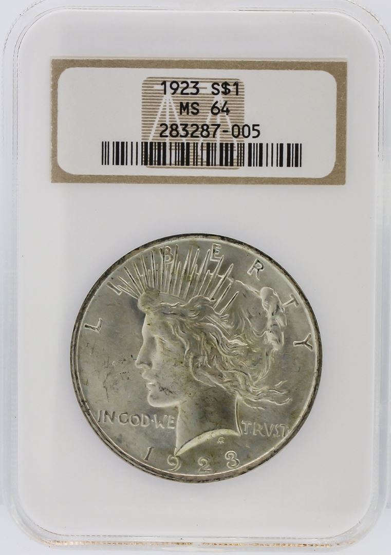 One 1923 NGC MS64 Peace Silver Dollar. NGC Certified.