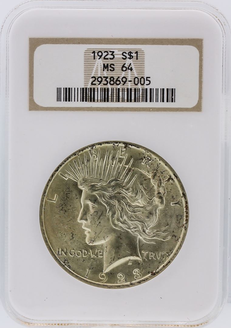 One 1923 NGC MS64 Peace Silver Dollar. NGC Certified.