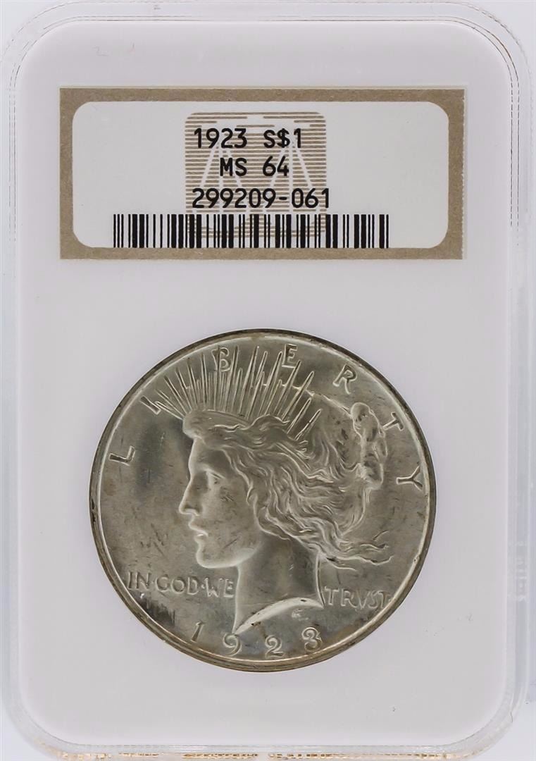 One 1923 NGC MS64 Peace Silver Dollar. NGC Certified.