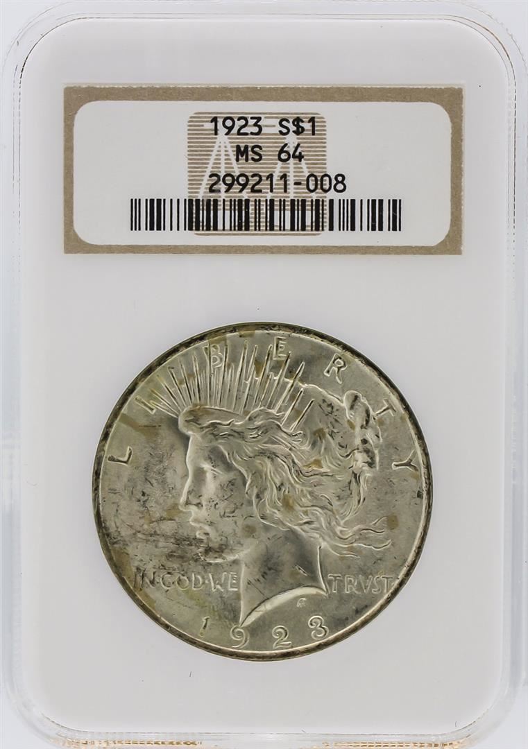 One 1923 NGC MS64 Peace Silver Dollar. NGC Certified.