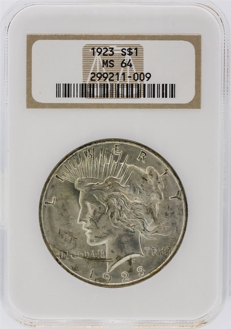 One 1923 NGC MS64 Peace Silver Dollar. NGC Certified.