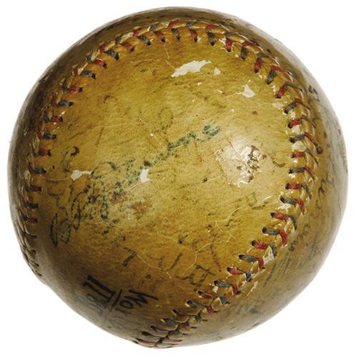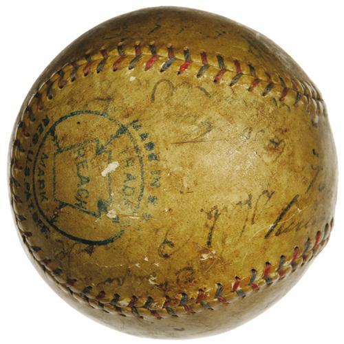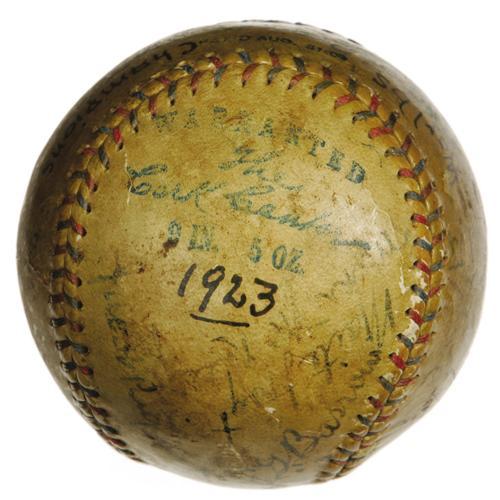 <B>1923 New York Yankees Team Signed Baseball.</B></I> A bold black fountain pen notation on this OAL (Johnson) ball announces for the first of twenty-six times in franchise history, "World's Champions." This monumentally important sphere should impress even the Yankee haters for its assemblage of signatures that documents the establishment of the Bronx as the capital of the baseball world. Most notable, of course, is Babe Ruth, who shares his appropriate sweet spot position with Kenesaw Mountain Landis, whose appearance on this ball suggests World Series vintage. Hall of Fame executive Ed Barrow is just to the right, with Jacob Ruppert as well. Each of these important autographs rates 4/10 or better. Among the other autographs still apparent after eight decades are Hoyt, Pennock, Bush, Pipp, Scott and Witt, with the balance teetering on the edge of, or falling beyond, the bounds of illegibility. Deep toning only adds to the vintage appeal. Certainly not a pristine example, but a ball that more than makes up for its condition flaws with top-tier historical relevance. <I>LOA from PSA/DNA. LOA from James Spence Authentication.</B></I><BR><BR><b>Shipping:</b> Balls, Pucks, etc., Small (<a target="_blank" href="http://www.heritageauctions.com/common/shipping.php">view shipping information</a>)