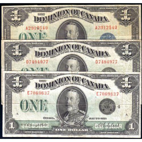 1923 One Dollar McCavour-Saunders, Blue Seal, Group 2, DC-25h, Serial Number A2912549 C, 1923 One Dollar Campbell-Sellar, Black Seal Group 3, DC-25n, Serial Number D749977 D and 1923 One Dollar Campbell-Clark, Black Seal, Group 4, DC-25o, Serial Number E706937 A. Total three notes, F-VF or better