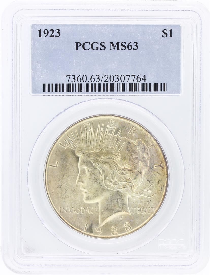 One 1923 PCGS MS63 Peace Silver Dollar. PCGS Certified.