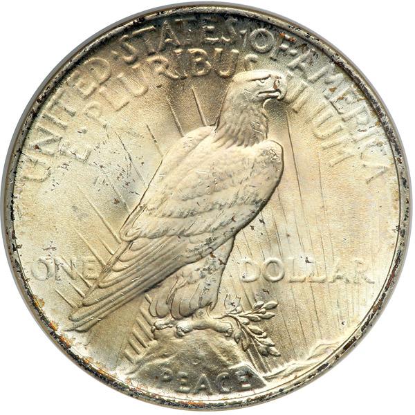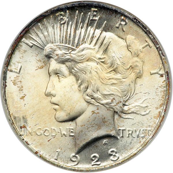 1923 Peace Dollar. NGC graded MS-66. A fresh looking gem glittering with intense luster and some mottled toning on both sides. Pop 2128; 93 finer.