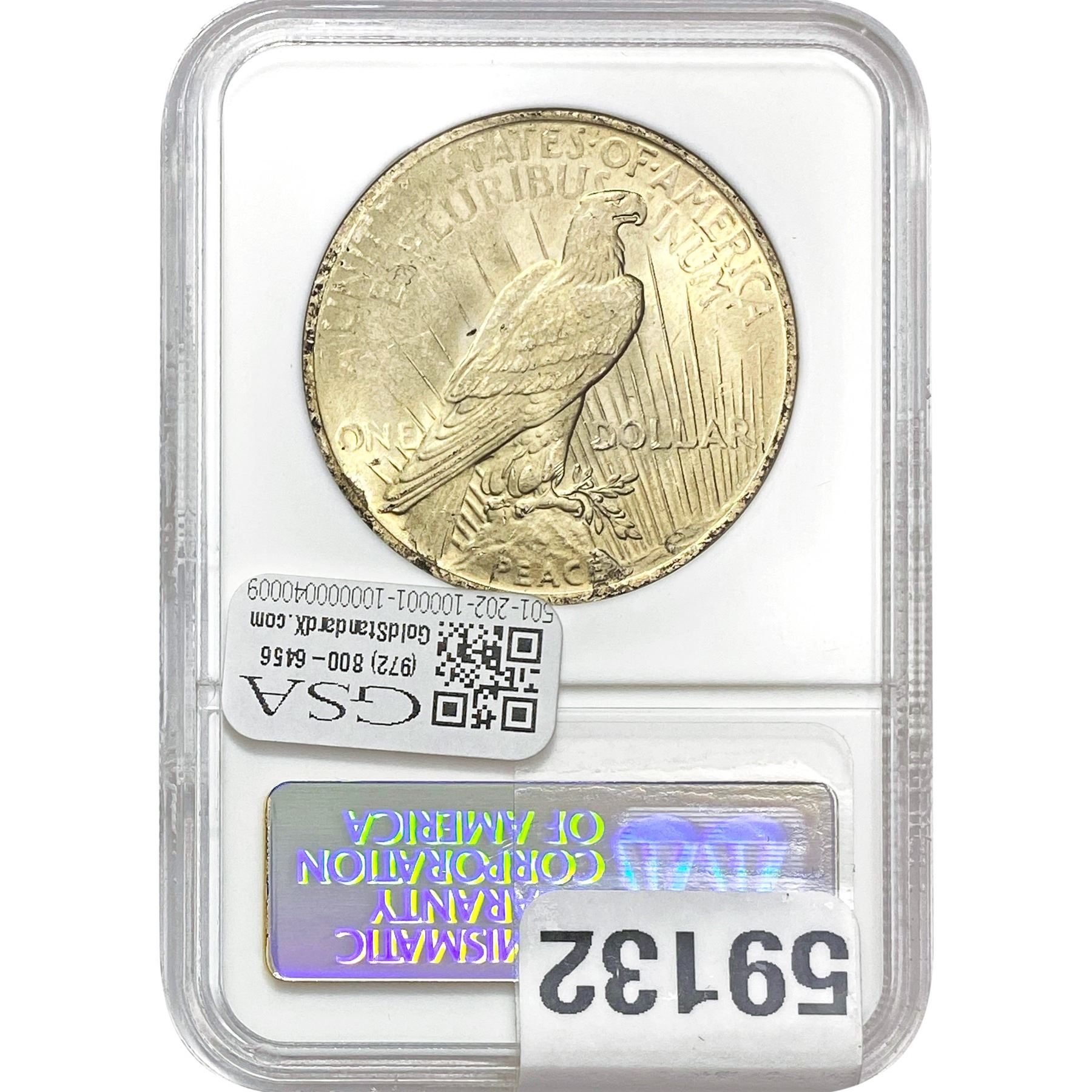 e. Coins sold referencing a third-party grading service are sold “AS IS” without any express or implied warranty, except for a guarantee by GSA that they are genuine. Removal or alteration of the holder, voids all of Bidder’s claims concerning that Product. Certain warranties may be available from the grading services and Bidders are referred to them for further details: Numismatic Guaranty Corporation (NGC), PO Box 4776, Sarasota, FL 34230, www.ngccoin.com/services/writtenguarantee.asp; Professional Coin Grading Services (PCGS), PO Box 9458, Newport Beach, CA 92658, www.pcgs.com/guarantee.html; ANACS, 6555 S. Kenton St., Ste. 303, Englewood, CO 80111; and Independent Coin Grading Co. (ICG), 7901 East Bellview, Ave., Suite 50, Englewood, CO 80111.
