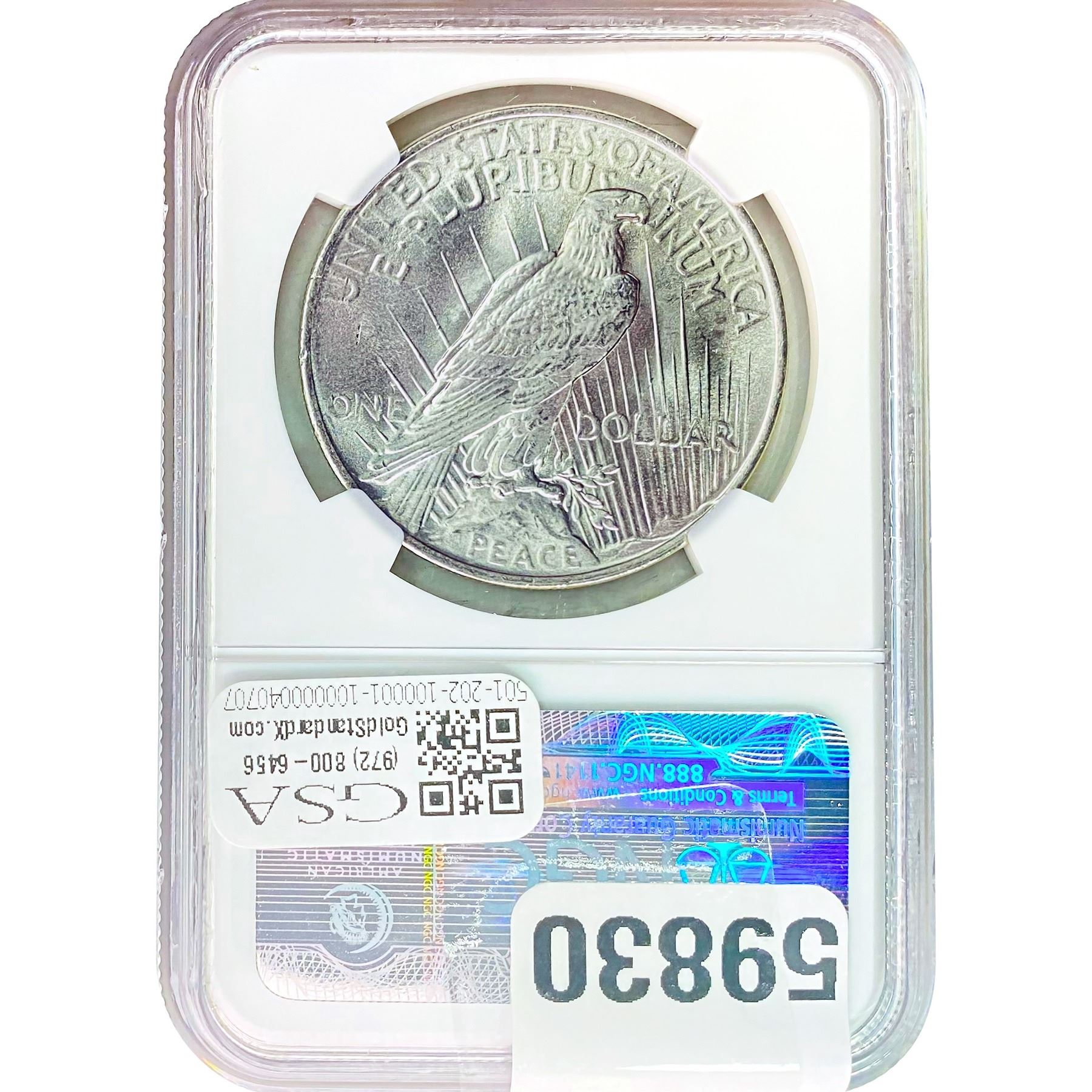 e. Coins sold referencing a third-party grading service are sold “AS IS” without any express or implied warranty, except for a guarantee by GSA that they are genuine. Removal or alteration of the holder, voids all of Bidder’s claims concerning that Product. Certain warranties may be available from the grading services and Bidders are referred to them for further details: Numismatic Guaranty Corporation (NGC), PO Box 4776, Sarasota, FL 34230, www.ngccoin.com/services/writtenguarantee.asp; Professional Coin Grading Services (PCGS), PO Box 9458, Newport Beach, CA 92658, www.pcgs.com/guarantee.html; ANACS, 6555 S. Kenton St., Ste. 303, Englewood, CO 80111; and Independent Coin Grading Co. (ICG), 7901 East Bellview, Ave., Suite 50, Englewood, CO 80111.