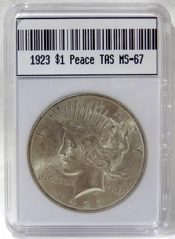 Until the mid-1940s, this 1923 Philadelphia Mint issue was regarded as the most elusive Peace dollar. It brought the highest bids in a large 1945 auction. Not even the low-mintage 1928 issue was higher valued (today it sells for over a thousand dollars). Now, after the final Treasury releases of the 1960s, the 1923 is one of the most affordable Brilliant Uncirculated classic U.S. silver dollars. Includes the Insurance Appraisal, Control Number F032137