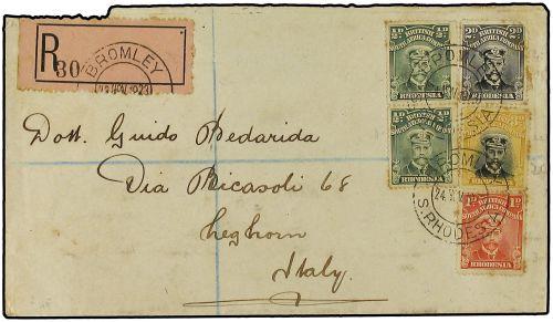 1923 Registered envelope (no flap) to Livorno, Italy, franked ½d(2), 1d., 2d. & 3d. "Admirals" tied by BROMLEY date stamp. On reverse, Harandellas transit cds.