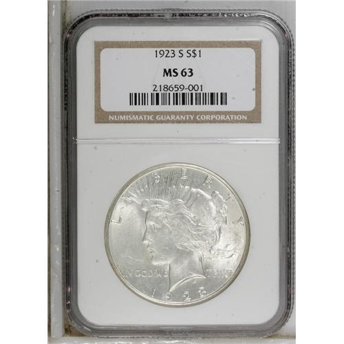 <B>1923-S $1 MS63 NGC.</B></I> NGC Census: (1434/1521). PCGS Population (1753/1386). Mintage: 19,020,000. Numismedia Wsl. Price for NGC/PCGS coin in MS63: $60. (#7362)<BR><BR><b>Shipping:</b> Coins & Currency (<a target="_blank" href="http://www.heritageauctions.com/common/shipping.php">view shipping information</a>)