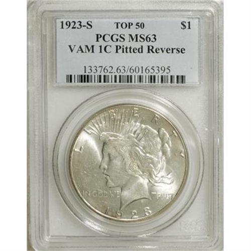 <B>1923-S $1 MS63 PCGS.</B></I> VAM 1C, Pitted Reverse, Top 50. PCGS Population (4/1). NGC Census: (0/0). (#133762)<BR><BR><b>Shipping:</b> Coins & Currency (<a target="_blank" href="http://www.heritageauctions.com/common/shipping.php">view shipping information</a>)