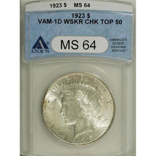 <B>1923 S$1 MS64 ANACS.</B></I> VAM-1D, Top 50. The prominent die break occurs on Liberty's cheek. A pleasing near-gem that exhibits a slight trace of light tan color here and there. Well struck, with some minor grade-defining luster grazes in the left obverse field.<BR><BR><b>Shipping:</b> Coins & Currency (<a target="_blank" href="http://www.heritageauctions.com/common/shipping.php">view shipping information</a>)