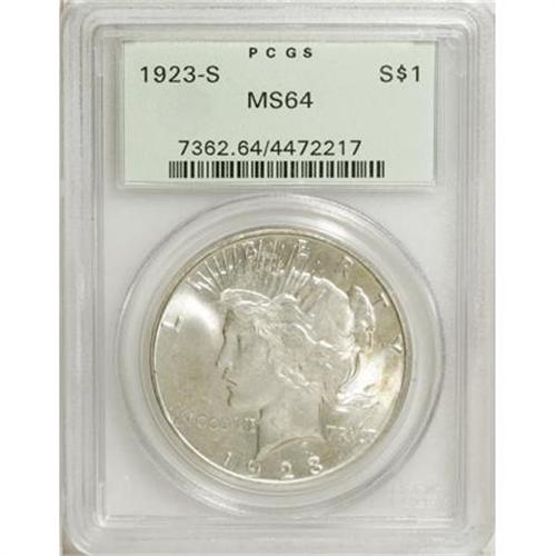 <B>1923-S $1 MS64 PCGS.</B></I> PCGS Population (1342/101). NGC Census: (1498/71). Mintage: 19,020,000. Numismedia Wsl. Price for NGC/PCGS coin in MS64: $220. (#7362)<BR><BR><B>Coin Engraver:</B> Anthony de Francisci<BR><BR><b>Shipping:</b> Coins & Currency (<a target="_blank" href="http://www.heritageauctions.com/common/shipping.php">view shipping information</a>)