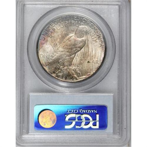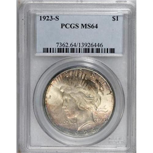 <B>1923-S $1 MS64 PCGS.</B></I> Well struck with intense luster and well defined stripes of plum and peripheral electric-blue toning. A few minor marks inhibit the grade. <BR><BR><B>Coin Engraver:</B> Anthony de Francisci<BR><BR><b>Shipping:</b> Coins & Currency (<a target="_blank" href="http://www.heritageauctions.com/common/shipping.php">view shipping information</a>)