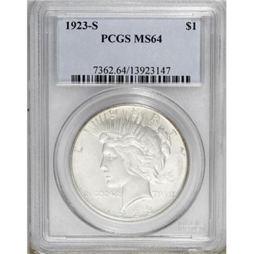 <B>1923-S $1 MS64 PCGS.</B></I> PCGS Population (1416/104). NGC Census: (1521/71). Mintage: 19,020,000. Numismedia Wsl. Price for NGC/PCGS coin in MS64: $220. (#7362)<BR><BR><B>Coin Engraver:</B> Anthony de Francisci<BR><BR><b>Shipping:</b> Coins & Currency (<a target="_blank" href="http://www.heritageauctions.com/common/shipping.php">view shipping information</a>)