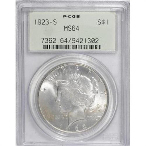 <B>1923-S $1 MS64 PCGS.</B></I> . PCGS Population (1441/105). NGC Census: (1532/71). Mintage: 19,020,000. Numismedia Wsl. Price for NGC/PCGS coin in MS64: $240. (#7362)<BR><BR><B>Coin Engraver:</B> Anthony de Francisci<BR><BR><b>Shipping:</b> Coins & Currency (<a target="_blank" href="http://www.heritageauctions.com/common/shipping.php">view shipping information</a>)