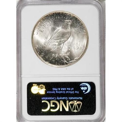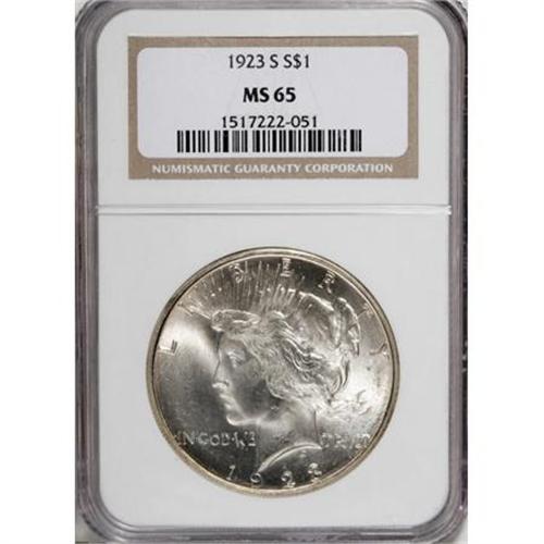 <B>1923-S $1 MS65 NGC.</B></I> Although a common date in circulated condition, in Gem Mint State the 1923-S becomes a conditional rarity, which along with a few other S-mint Peace dollars is among the most expensive in the series. This gorgeous piece offers radiant cartwheel luster more typical of a Morgan dollar, with a blush of lilac toning on each side and a bold strike. A nice one!<BR><BR><B>Coin Engraver:</B> Anthony de Francisci<BR><BR><b>Shipping:</b> Coins & Currency (<a target="_blank" href="http://www.heritageauctions.com/common/shipping.php">view shipping information</a>\)