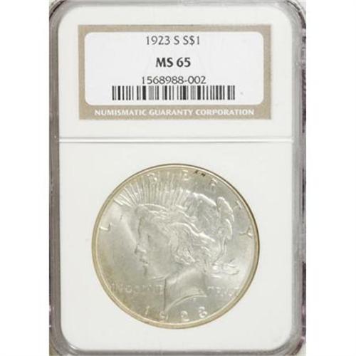 <B>1923-S $1 MS65 NGC.</B></I> As with most S-mints in the Peace dollar series, the 1923-S is a strike rarity as well as a condition rarity. One might not know that from viewing this coin, though. The central details are uncommonly bold on the obverse, and there is just the slightest softness present on the lowest row of feathers on the reverse. The lustrous surfaces are mostly brilliant with an arc of deep russet at the top of the reverse.<BR><BR><B>Coin Engraver:</B> Anthony de Francisci<BR><BR><b>Shipping:</b> Coins & Currency (<a target="_blank" href="http://www.heritageauctions.com/common/shipping.php">view shipping information</a>)