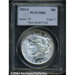<table><tbody><tr><td><table> <TR><TD width="100%"><TABLE cellSpacing=1 cellPadding=3 width="100%" border=0><TBODY><TR><TD width="100%" bgColor=#79735c><FONT face=arial color=#ffffff size=3><B>Description</B> </FONT></TD></TR><TR><TD width="100%" bgColor=#ffffff><FONT face=arial size=2><B>1923-S $1 MS65 PCGS.</B></I> This sparkling Gem defies all the rules for S-mint Peace dollars. The centers are very strongly defined; in fact, the eagle's feathers on the reverse are just a bit shy of absolute fullness. Exceptionally lustrous, the surfaces are mostly brilliant with just the faintest speckling of golden patina on the obverse. A premium example of this very scarce issue. Population: 54 in 65, 3 finer (10/03). </FONT></TD></TR></TBODY></TABLE></TD></TR></TBODY></TABLE><BR><A name=PricesRealized></A><TABLE cellSpacing=0 cellPadding=0 width="100%" bgColor=#000000 border=0><TBODY><TR><TD width="100%"><TABLE cellSpacing=1 cellPadding=3 width="100%" border=0><TBODY><TR><TD width="100%" bgColor=#79735c><A name=PR><FONT face=arial color=#ffffff size=3><B>Previous Prices from Heritage Auctions</B> </FONT></A></TD></TR><TR><TD bgColor=#f6f6ed><TABLE cellSpacing=0 cellPadding=0 width="100%" border=1><TBODY><TR><TD align=middle width="33%"><B>Date</B></TD><TD align=middle width="33%"><B>Service</B></TD><TD align=middle width="33%"><B>Price</B></TD></TR><TR bgColor=whitesmoke><TD width="33%"><B>07/17/2001</B></TD><TD width="33%">NGC</TD><TD width="33%">$2,050.00</TD></TR><TR bgColor=whitesmoke><TD width="33%"><B>01/07/2004</B></TD><TD width="33%">PCGS</TD><TD width="33%">$5,750.00</TD></TR><TR bgColor=whitesmoke><TD width="33%"><B>11/07/2003</B></TD><TD width="33%">NGC</TD><TD width="33%">$2,817.50</TD></TR><TR bgColor=whitesmoke><TD width="33%"><B>09/20/2003</B></TD><TD width="33%">PCGS</TD><TD width="33%">$2,357.50</TD></TR><TR bgColor=whitesmoke><TD width="33%"><B>05/31/2003</B></TD><TD width="33%">NGC</TD><TD width="33%">$2,875.00</TD></TR><TR bgColor=whitesmoke><TD width="33%"><B>03/01/2003</B></TD><TD width="33%">NGC</TD><TD width="33%">$1,840.00</TD></TR><TR bgColor=whitesmoke><TD width="33%"><B>03/01/2003</B></TD><TD width="33%">NGC</TD><TD width="33%">$1,610.00</TD></TR><TR bgColor=whitesmoke><TD width="33%"><B>03/01/2003</B></TD><TD width="33%">NGC</TD><TD width="33%">$3,680.00</TD></TR><TR bgColor=whitesmoke><TD width="33%"><B>09/28/2002</B></TD><TD width="33%">ANACS</TD><TD width="33%">$1,322.50</TD></TR><TR bgColor=whitesmoke><TD width="33%"><B>09/28/2002</B></TD><TD width="33%">NGC</TD><TD width="33%">$2,875.00</TD></TR><TR bgColor=whitesmoke><TD width="33%"><B>04/27/2002</B></TD><TD width="33%">NGC</TD><TD width="33%">$1,840.00</TD></TR><TR bgColor=whitesmoke><TD width="33%"><B>01/13/2002</B></TD><TD width="33%">NGC</TD><TD width="33%">$2,530.00</TD></TR><TR bgColor=whitesmoke><TD width="33%"><B>11/15/2001</B></TD><TD width="33%">NGC</TD><TD width="33%">$1,667.50</TD></TR><TR bgColor=whitesmoke><TD width="33%"><B>10/07/2001</B></TD><TD width="33%">NGC</TD><TD width="33%">$1,495.00</TD></TR><TR bgColor=whitesmoke><TD width="33%"><B>05/31/2001</B></TD><TD width="33%">NGC</TD><TD width="33%">$1,610.00</TD></TR><TR bgColor=whitesmoke><TD width="33%"><B>04/05/2001</B></TD><TD width="33%">PCGS</TD><TD width="33%">$2,990.00</TD></TR><TR bgColor=whitesmoke><TD width="33%"><B>03/13/1999</B></TD><TD width="33%">NGC</TD><TD width="33%">$2,185.00</TD></TR><TR bgColor=whitesmoke><TD width="33%"><B>01/08/1999</B></TD><TD width="33%">NGC</TD><TD width="33%">$2,127.50</TD></TR><TR bgColor=whitesmoke><TD width="33%"><B>08/07/1998</B></TD><TD width="33%">PCGS</TD><TD width="33%">$2,760.00</TD></TR><TR bgColor=whitesmoke><TD width="33%"><B>03/21/1998</B></TD><TD width="33%">NGC</TD><TD width="33%">$2,472.50</TD></TR><TR bgColor=whitesmoke><TD width="33%"><B>01/11/1997</B></TD><TD width="33%">NGC</TD><TD width="33%">$2,357.50</TD></TR><TR bgColor=whitesmoke><TD width="33%"><B>01/11/1997</B></TD><TD width="33%">PCGS</TD><TD width="33%">$2,875.00</TD></TR><TR bgColor=whitesmoke><TD width="33%"><B>08/19/1995</B></TD><TD width="33%">PCGS</TD><TD width="33%">$3,575.00</TD></TR><TR bgColor=whitesmoke><TD width="33%"><B>07/31/1993</B></TD><TD width="33%">PCGS</TD><TD width="33%">$3,630.00</TD></TR><TR bgColor=whitesmoke><TD width="33%"><B>10/01/2001</B></TD><TD width="33%">PCGS</TD><TD width="33%">$2,875.00</TD></TR><TR bgColor=whitesmoke><TD width="33%"><B>05/27/2001</B></TD><TD width="33%">PCGS</TD><TD width="33%">$2,300.00</TD></TR><TR bgColor=whitesmoke><TD width="33%"><B>01/09/2002</B></TD><TD width="33%">NGC</TD><TD width="33%">$1,840.00</TD></TR><TR bgColor=whitesmoke><TD width="33%"><B>05/01/1995</B></TD><TD width="33%">NGC</TD><TD width="33%">$550.00</TD></TR><TR bgColor=whitesmoke><TD width="33%"><B>05/01/1999</B></TD><TD width="33%">NGC</TD><TD width="33%">$2,760.00</TD></TR><TR bgColor=whitesmoke><TD width="33%"><B>06/01/2000</B></TD><TD width="33%">NGC</TD><TD width="33%">$2,358.00</TD></TR><TR bgColor=whitesmoke><TD width="33%"><B>03/01/1999</B></TD><TD width="33%">NGC</TD><TD width="33%">$4,025.00</TD></TR><TR bgColor=whitesmoke><TD width="33%"><B>11/01/1999</B></TD><TD width="33%">PCGS</TD><TD width="33%">$2,530.00</TD></TR><TR bgColor=whitesmoke><TD width="33%"><B>09/01/1997</B></TD><TD width="33%">PCGS</TD><TD width="33%">$2,970.00</TD></TR><TR bgColor=whitesmoke><TD width="33%"><B>06/01/2000</B></TD><TD width="33%">PCGS</TD><TD width="33%">$3,335.00</TD></TR><TR bgColor=whitesmoke><TD width="33%"><B>01/01/1999</B></TD><TD width="33%">PCGS</TD><TD width="33%">$6,038.00</TD></TR><TR bgColor=whitesmoke><TD width="33%"><B>03/01/1999</B></TD><TD width="33%">PCGS</TD><TD width="33%">$4,140.00</TD></TR></TBODY></TABLE></TD></TR><TR><TD bgColor=#ffffff><FONT face=arial size=1 ?>PLEASE NOTE: All prices realized reflect the final hammer price PLUS the buyer's premium in auctions that charge a buyer's premium. Each item has a notation at the top of the listing indicating whether that lot included a buyer'